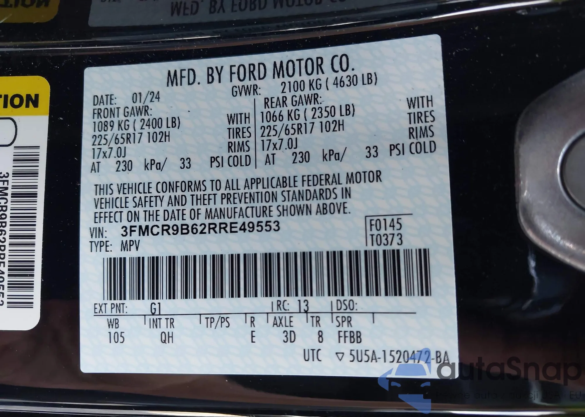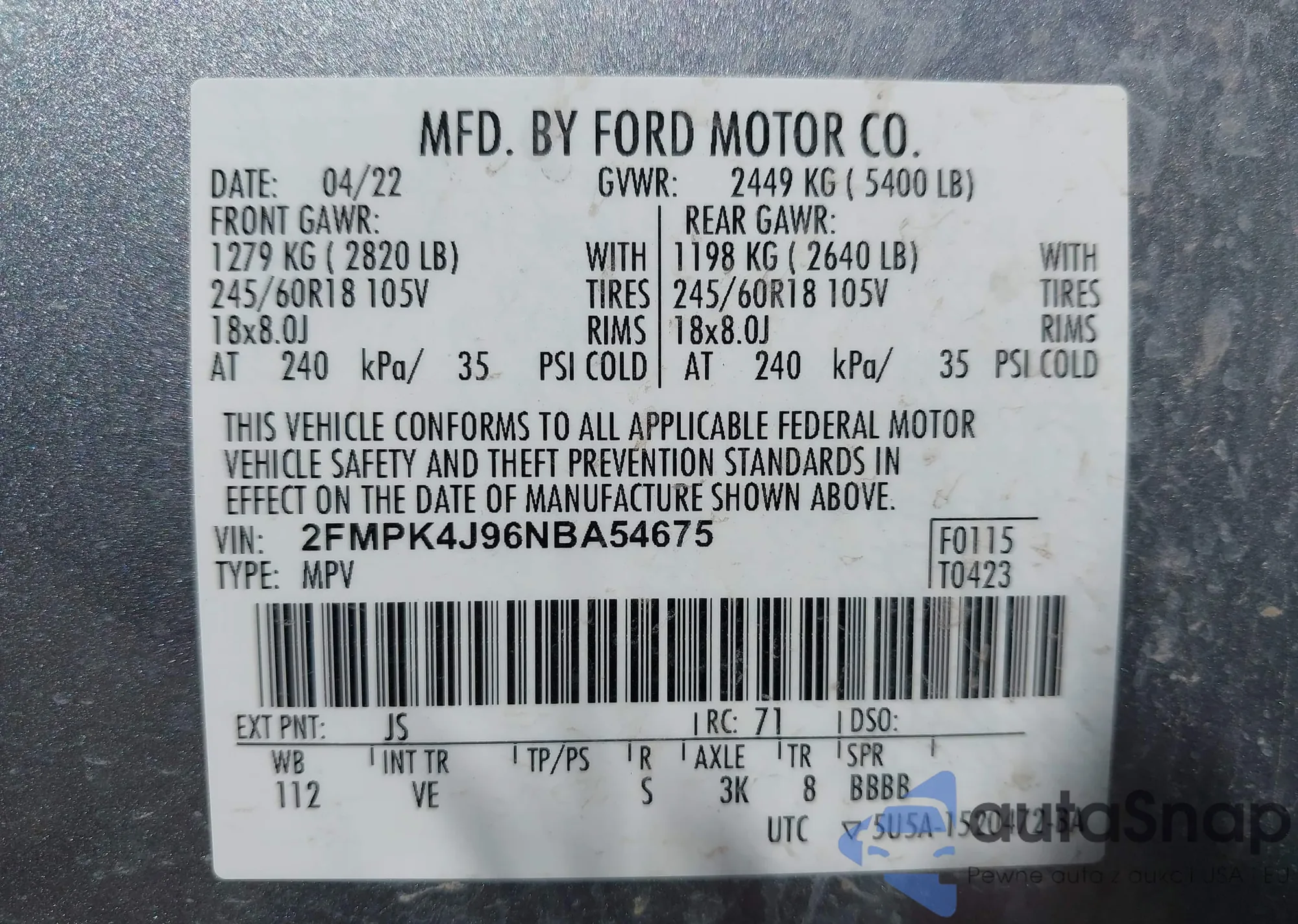 • VIN 2FMPK4J96NBA54675