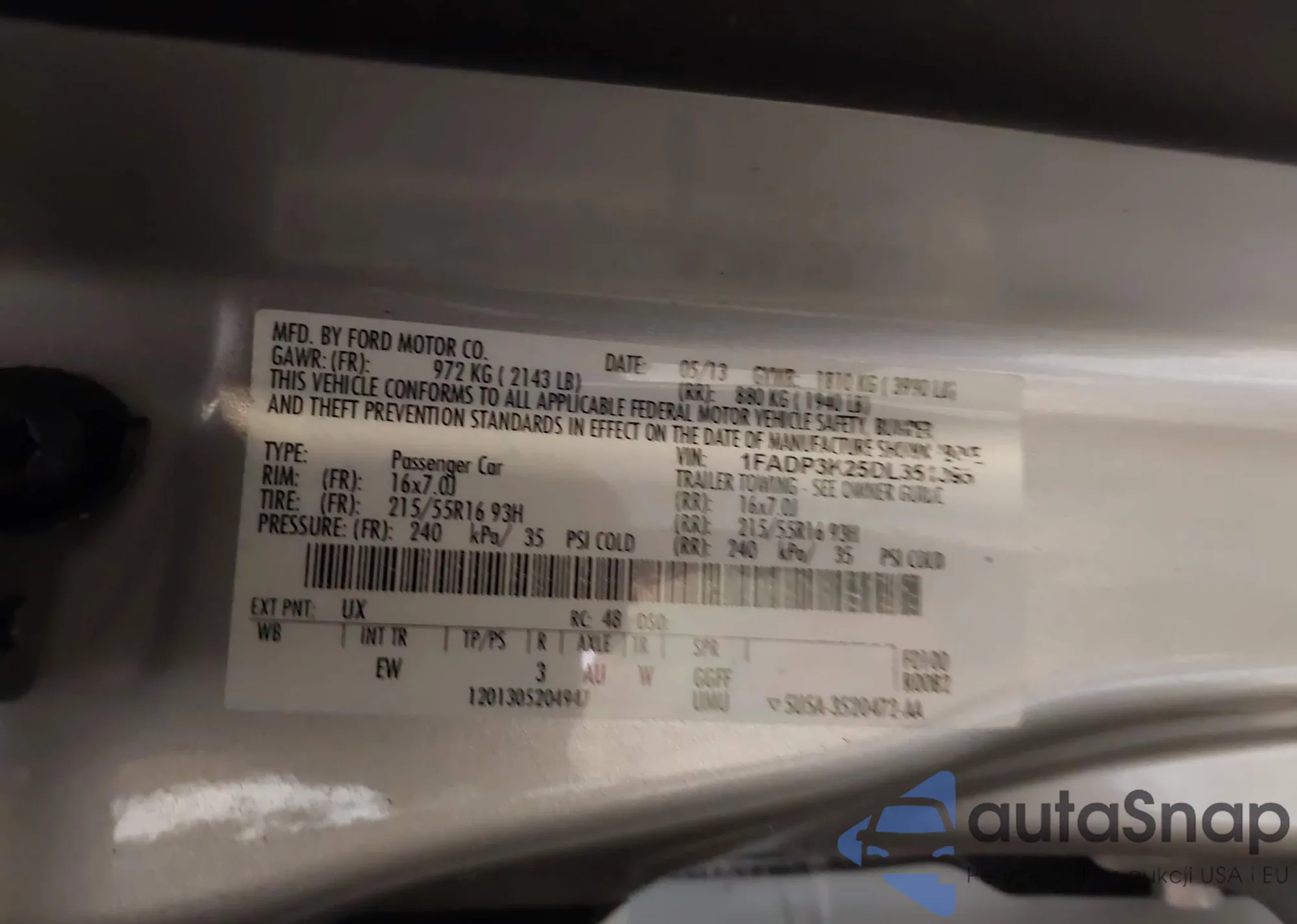 LOT: 43448761 VIN: 1FADP3K25DL351395