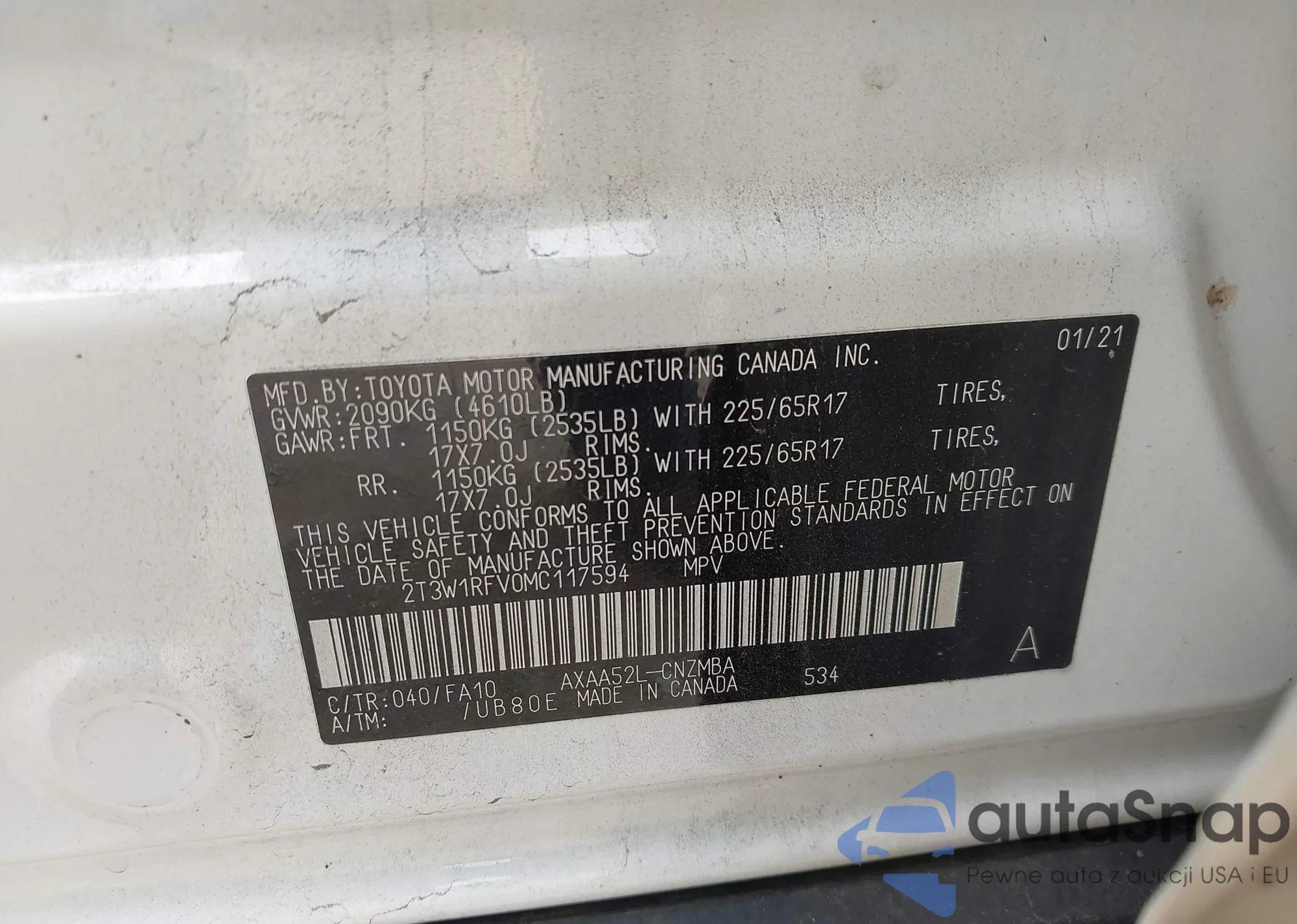LOT: 43257788 VIN: 2T3W1RFV0MC117594