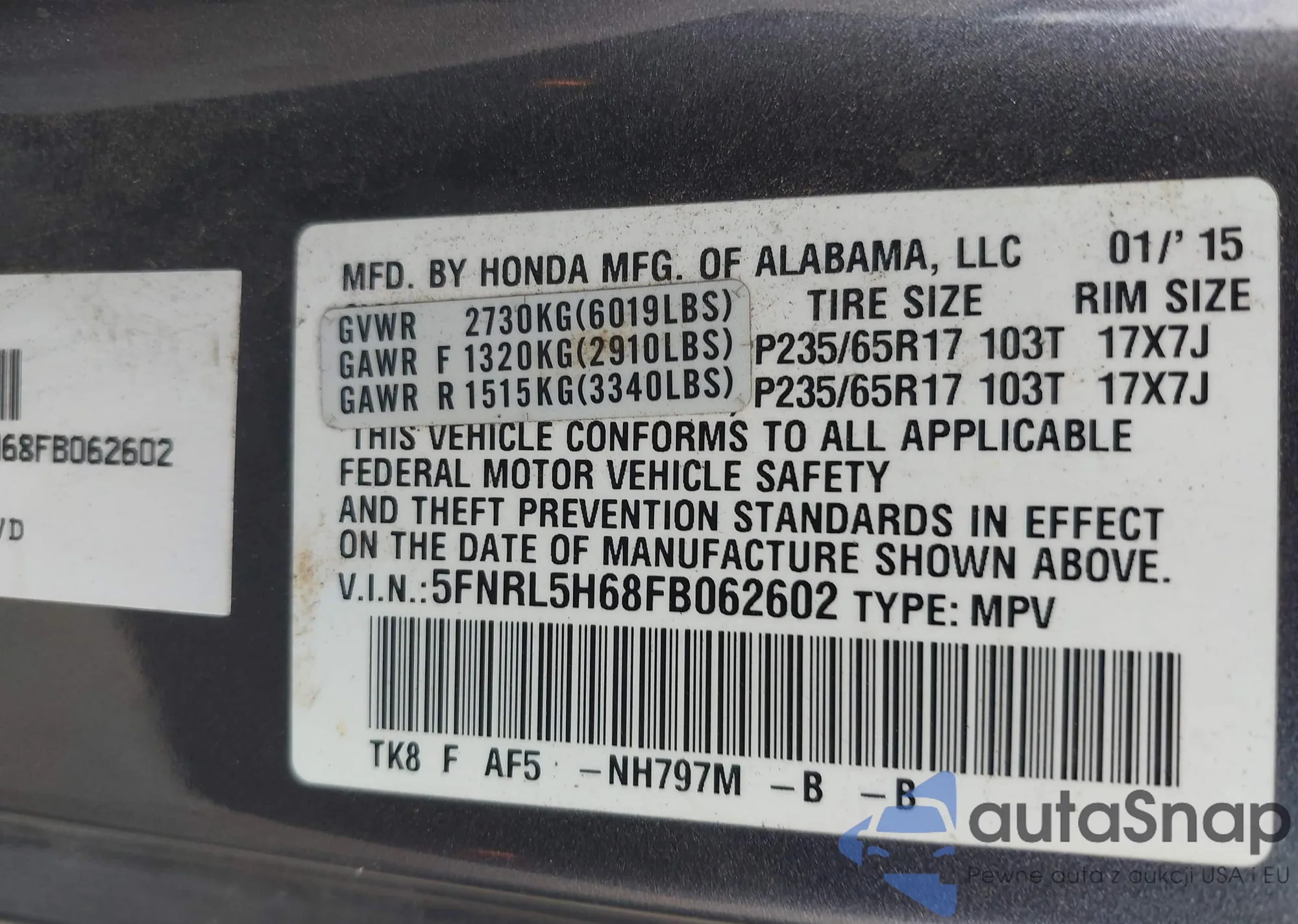 • VIN 5FNRL5H68FB062602