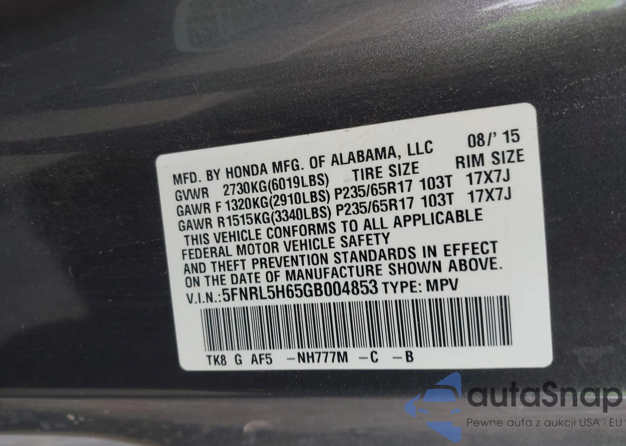 • VIN 5FNRL5H65GB004853
