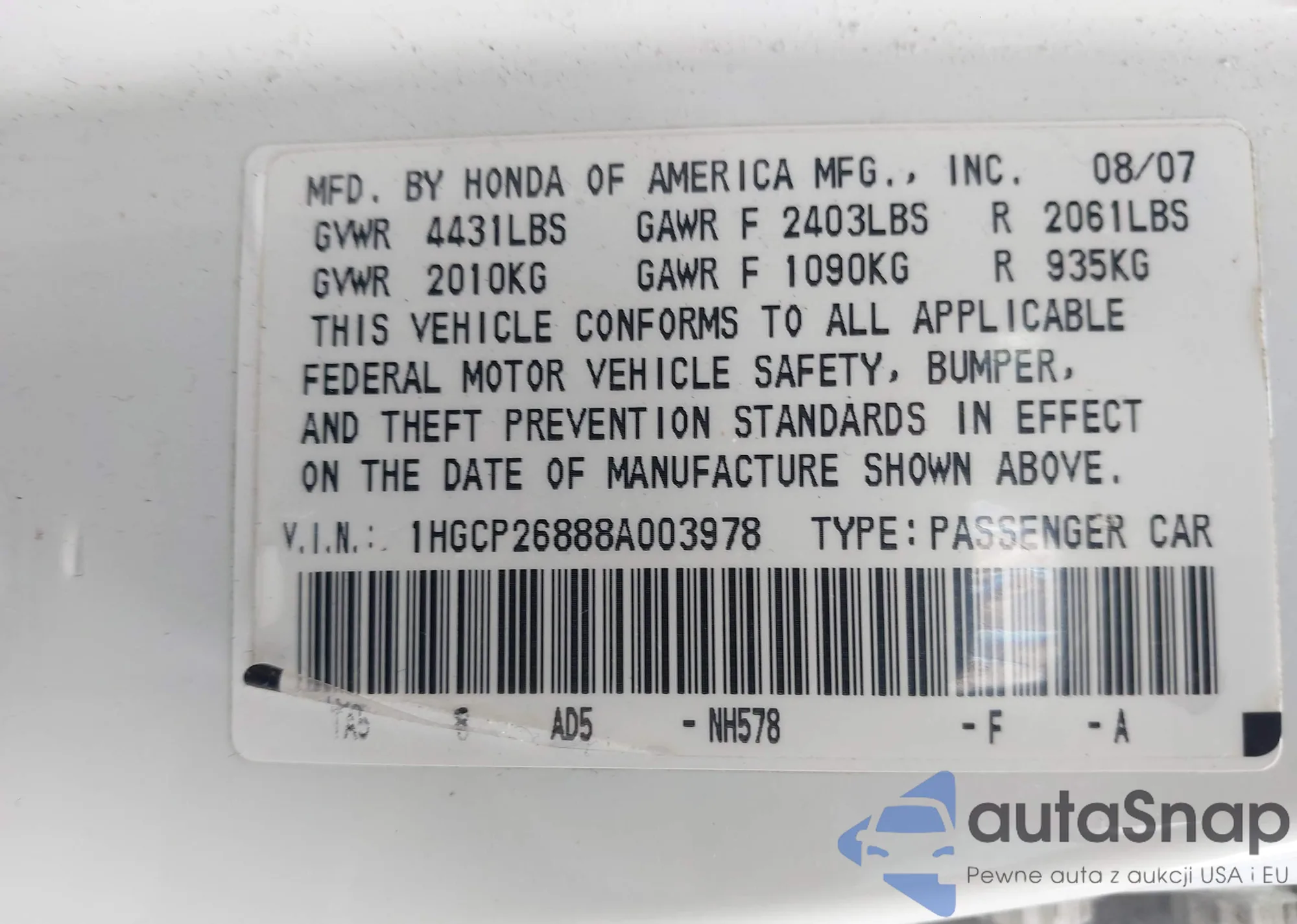 LOT: 43300945 VIN: 1HGCP26888A003978