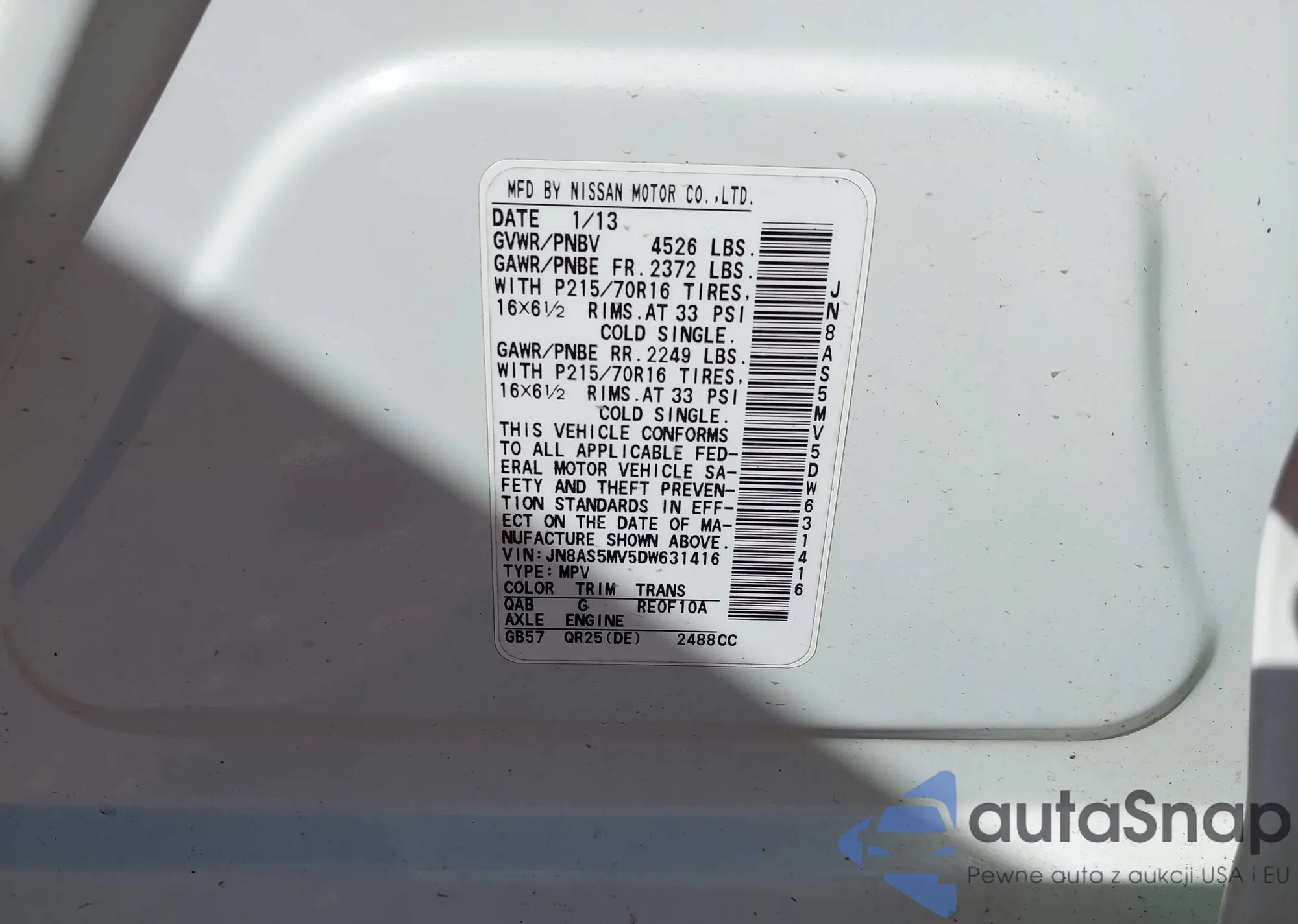 LOT: 43463262 VIN: JN8AS5MV5DW631416