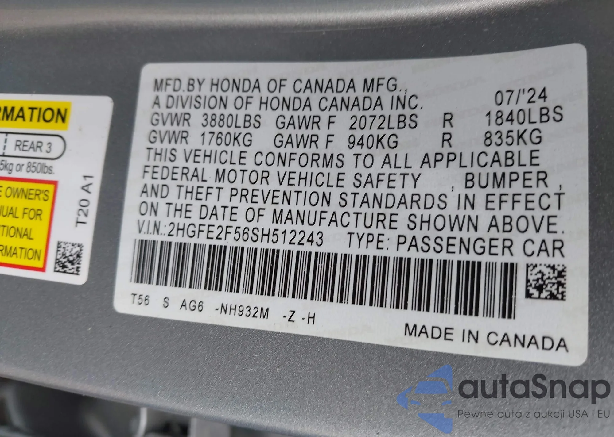 • VIN 2HGFE2F56SH512243