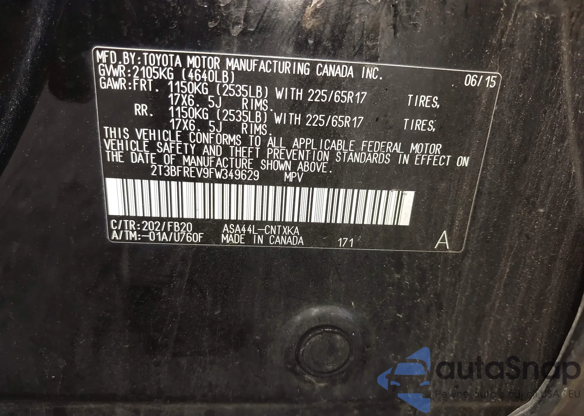 LOT: 43296201 VIN: 2T3BFREV9FW349629