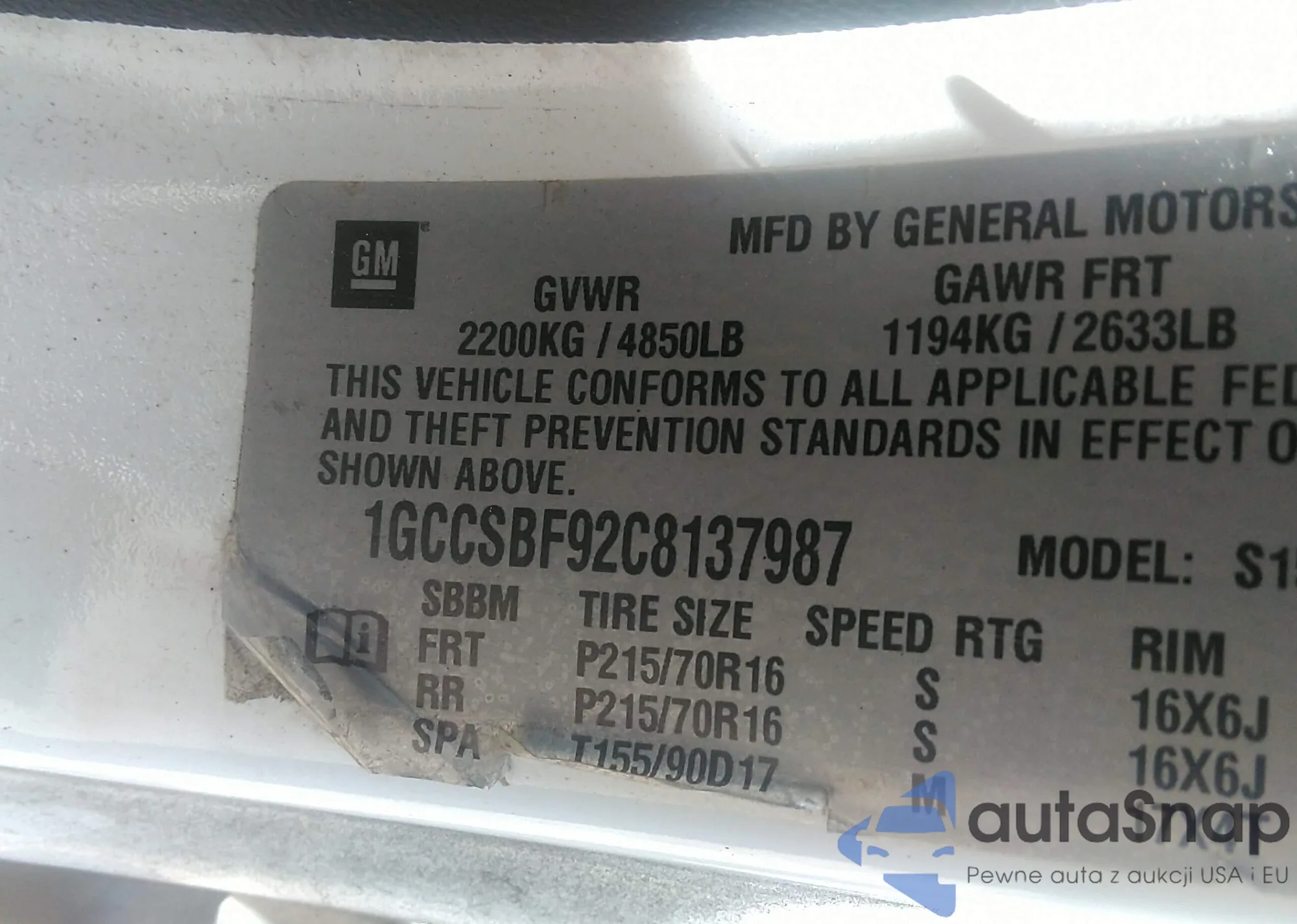 LOT: 43297310 VIN: 1GCCSBF92C8137987