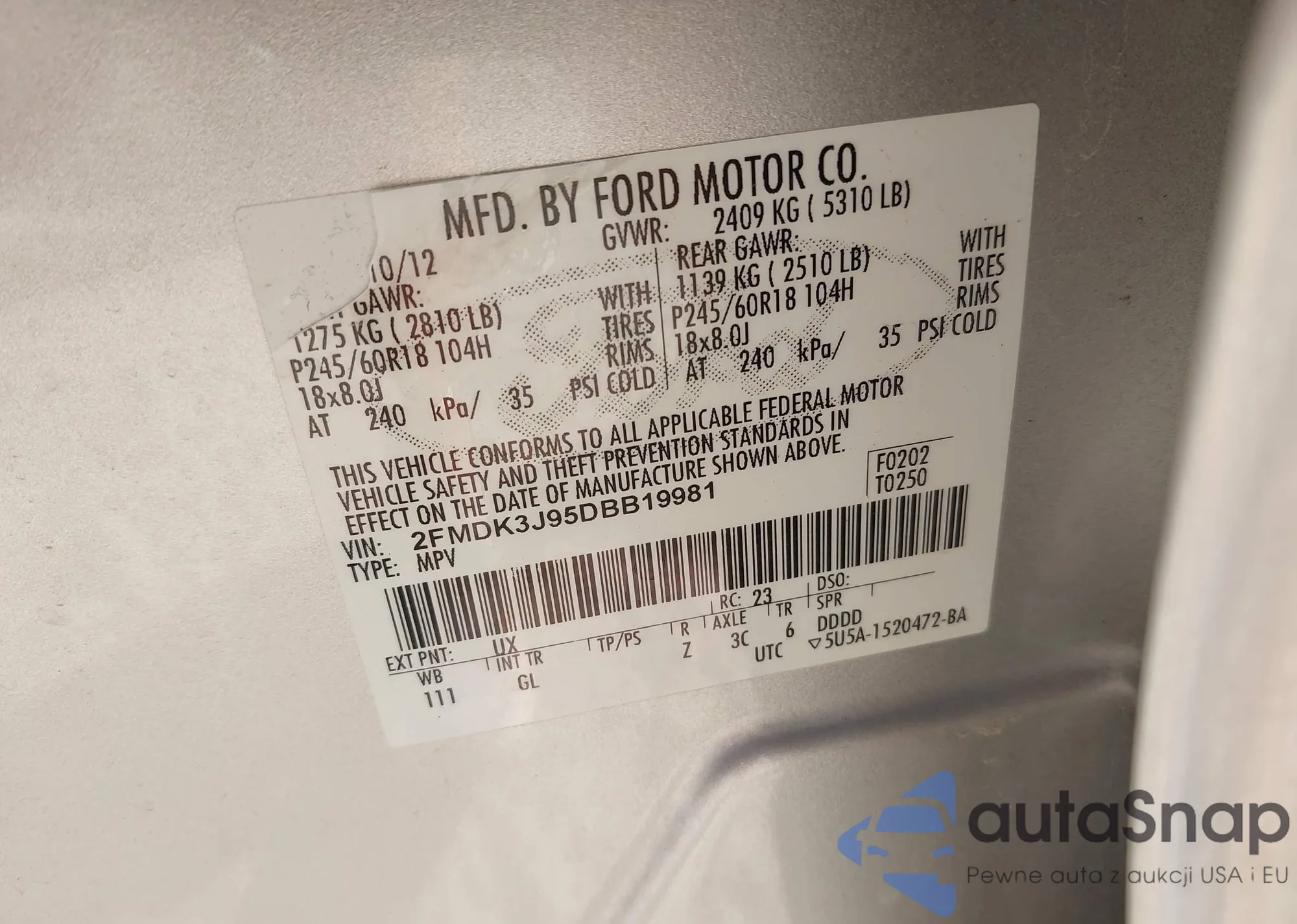 LOT: 43435190 VIN: 2FMDK3J95DBB19981