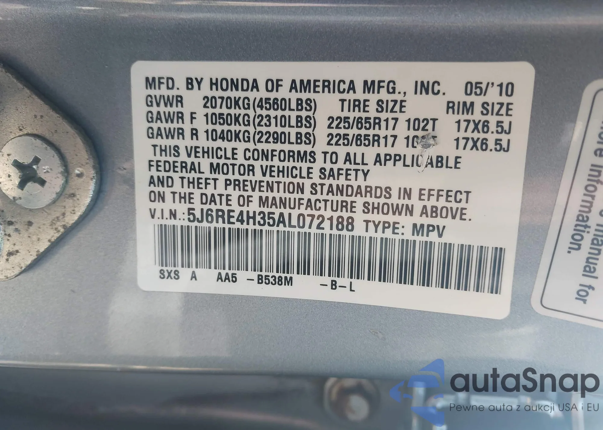 • VIN 5J6RE4H35AL072188