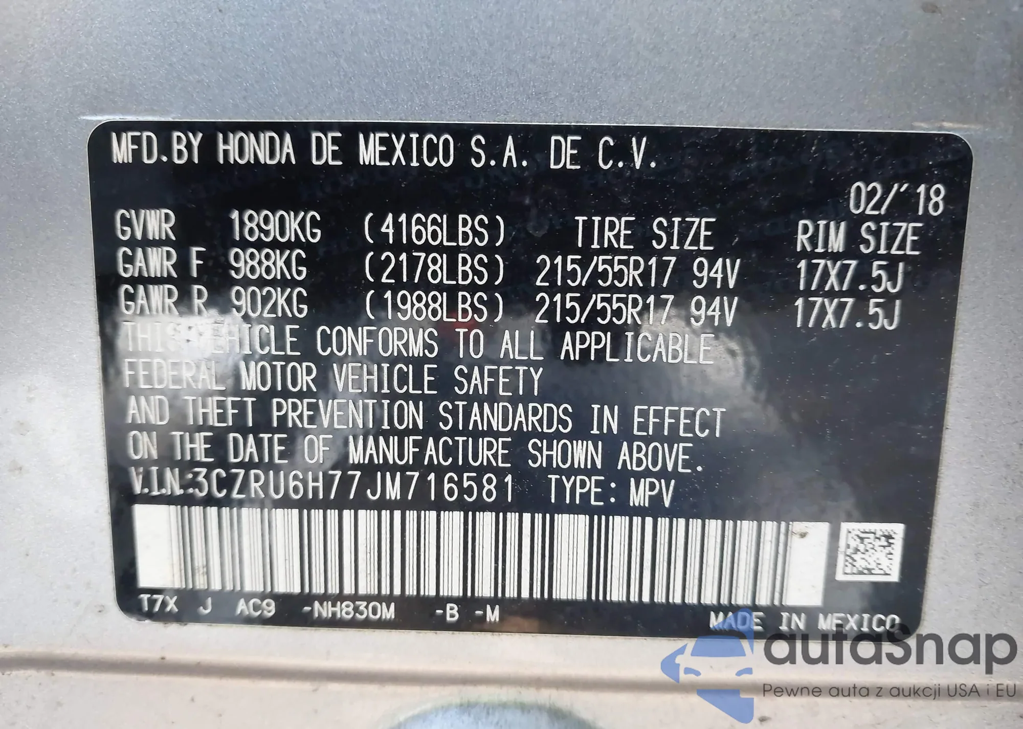• VIN 3CZRU6H77JM716581