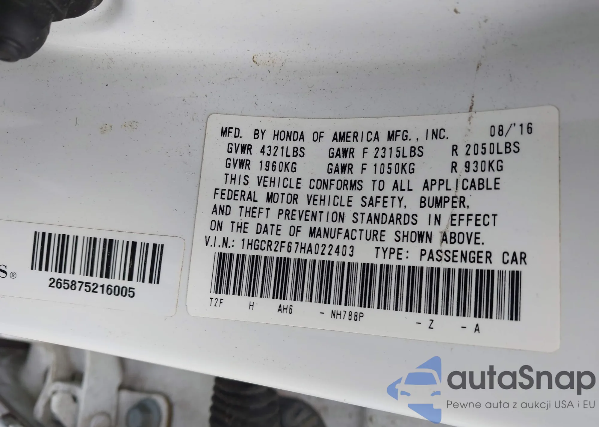 LOT: 43303202 VIN: 1HGCR2F67HA022403