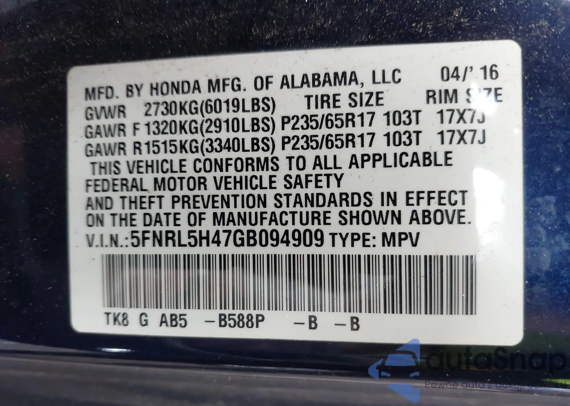 • VIN 5FNRL5H47GB094909