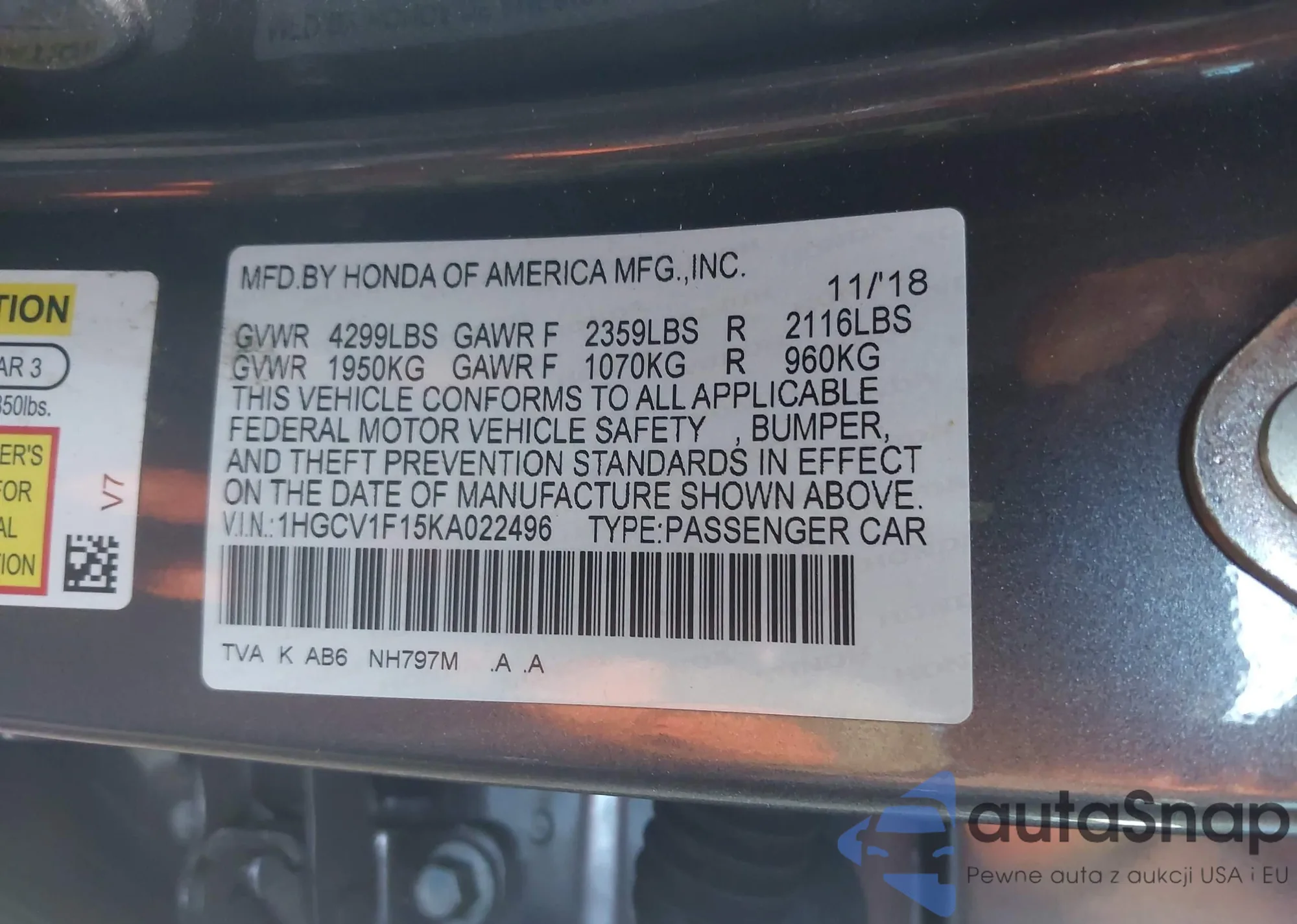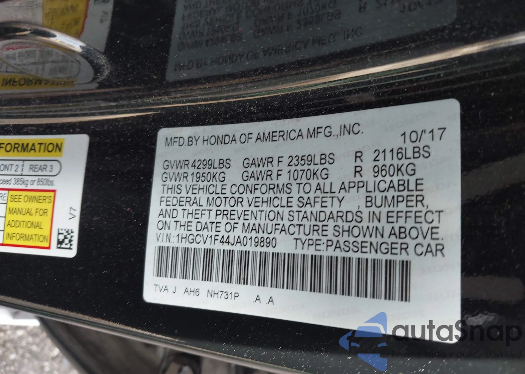 LOT: 43502747 VIN: 1HGCV1F44JA019890