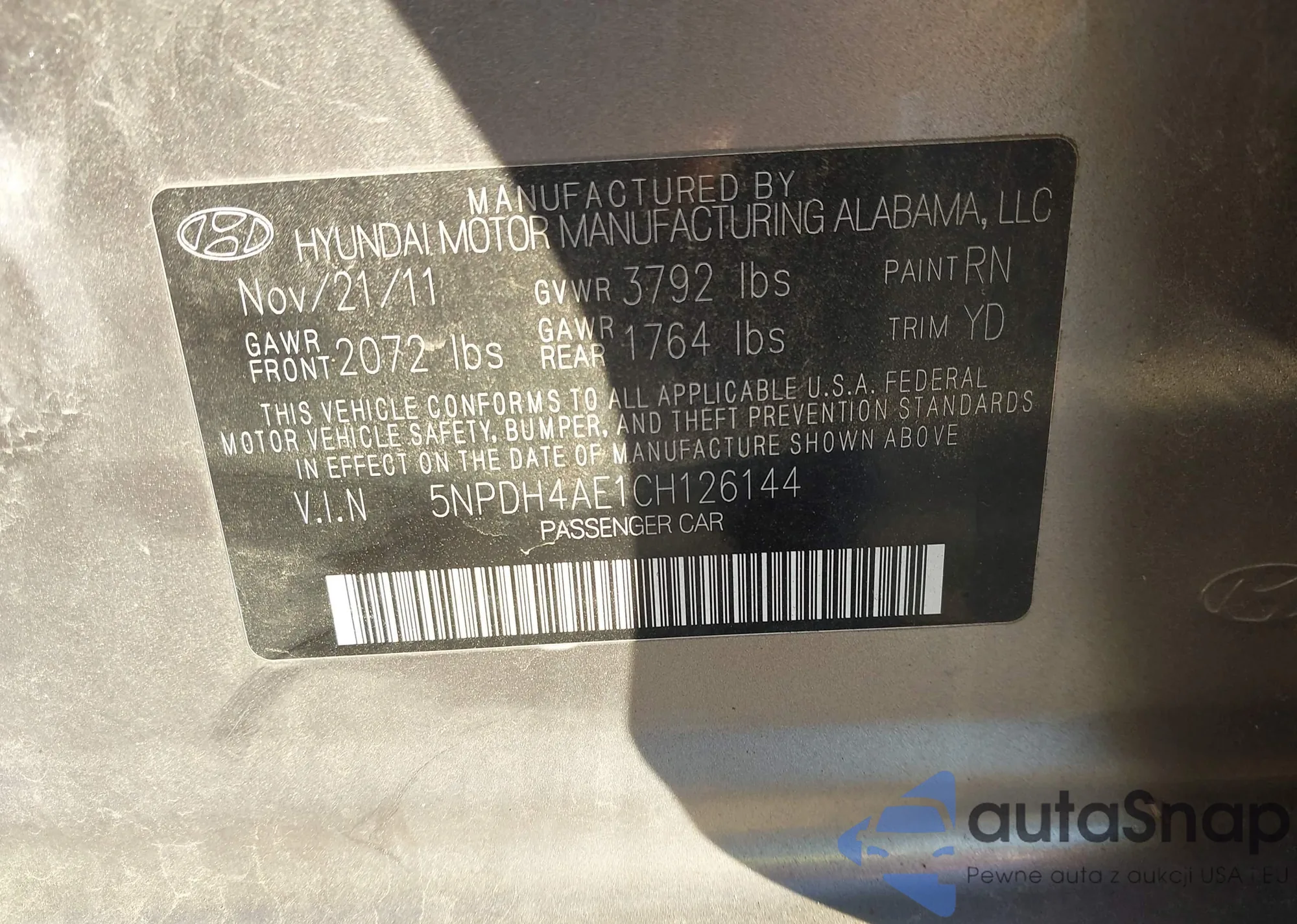 LOT: 43547021 VIN: KMHCU4AEXCU168949