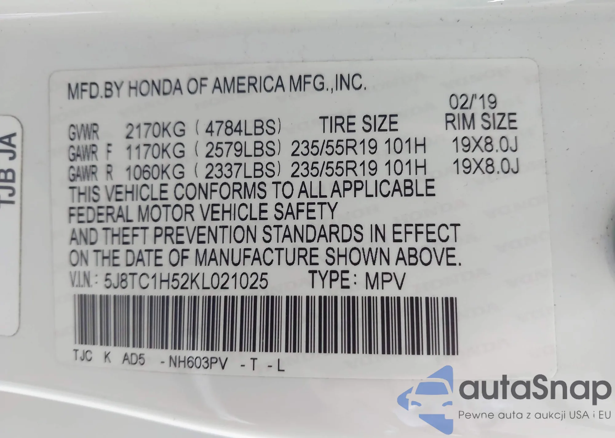 • VIN 5J8TC1H52KL021025