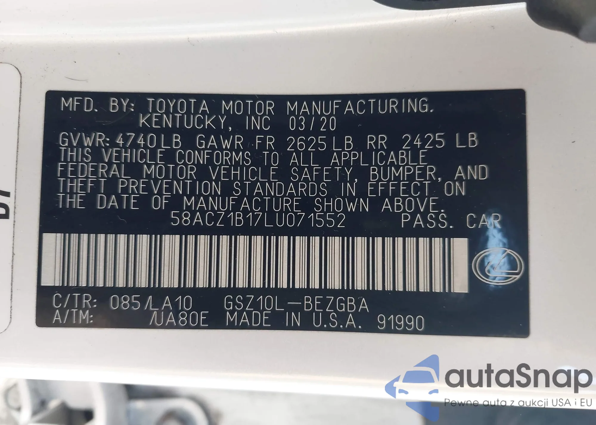 LOT: 43109824 VIN: JF2SKAGC1LH550145
