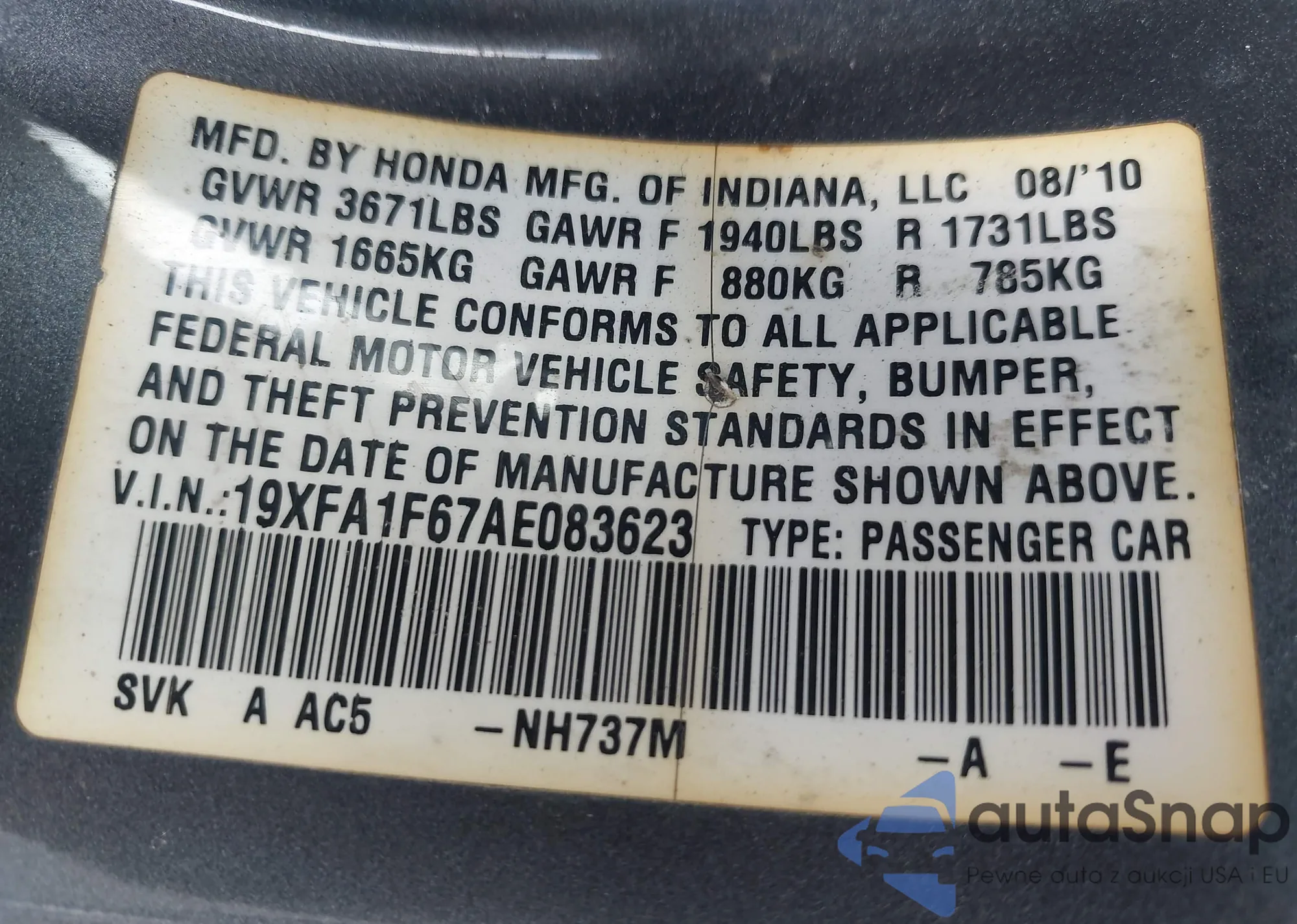 • VIN 19XFA1F67AE083623