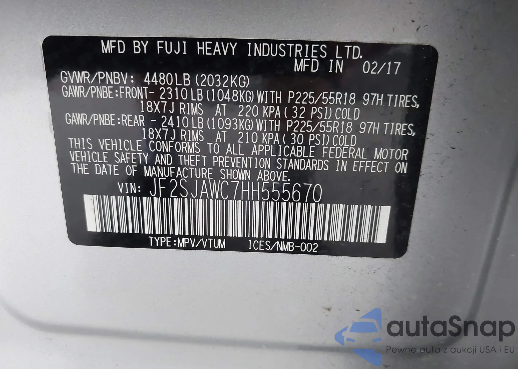 LOT: 43471642 VIN: JF2SJAWC7HH555670
