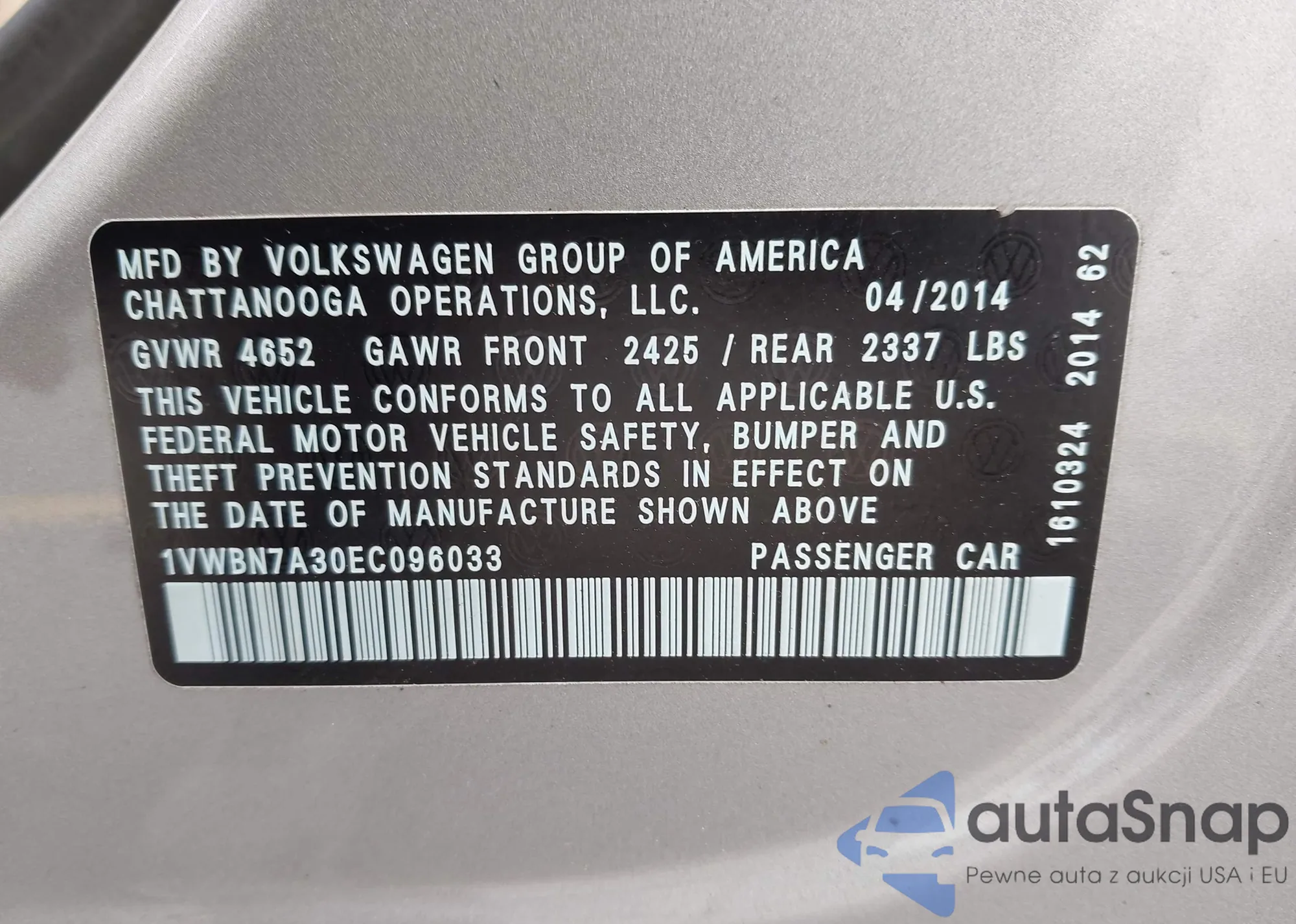 LOT: 43480535 VIN: 1VWBN7A30EC096033