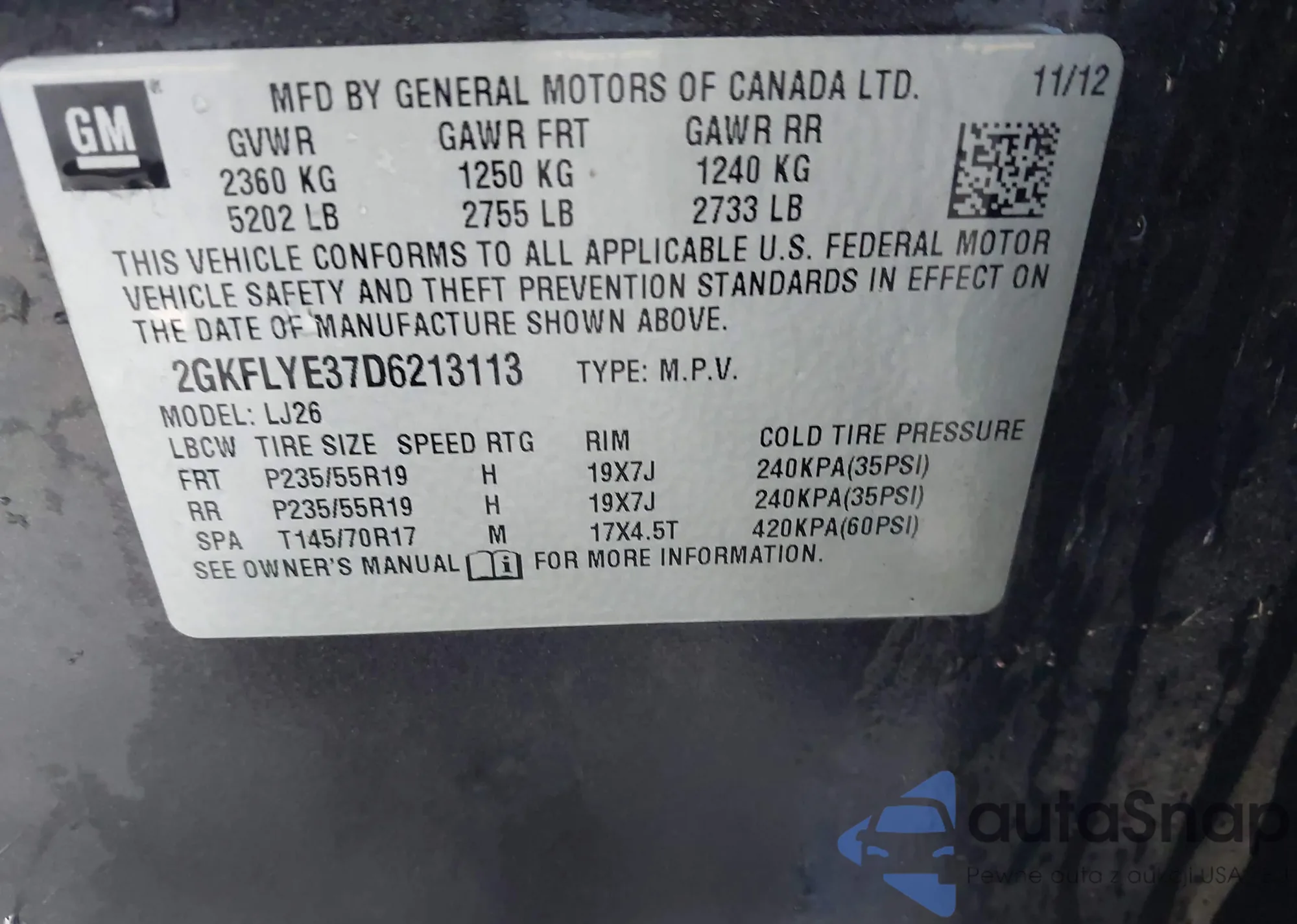 • VIN 2GKFLYE37D6213113