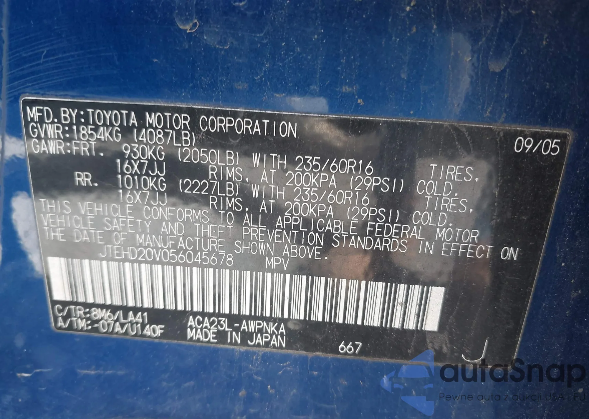 LOT: 43392773 VIN: JTEHD20V056045678