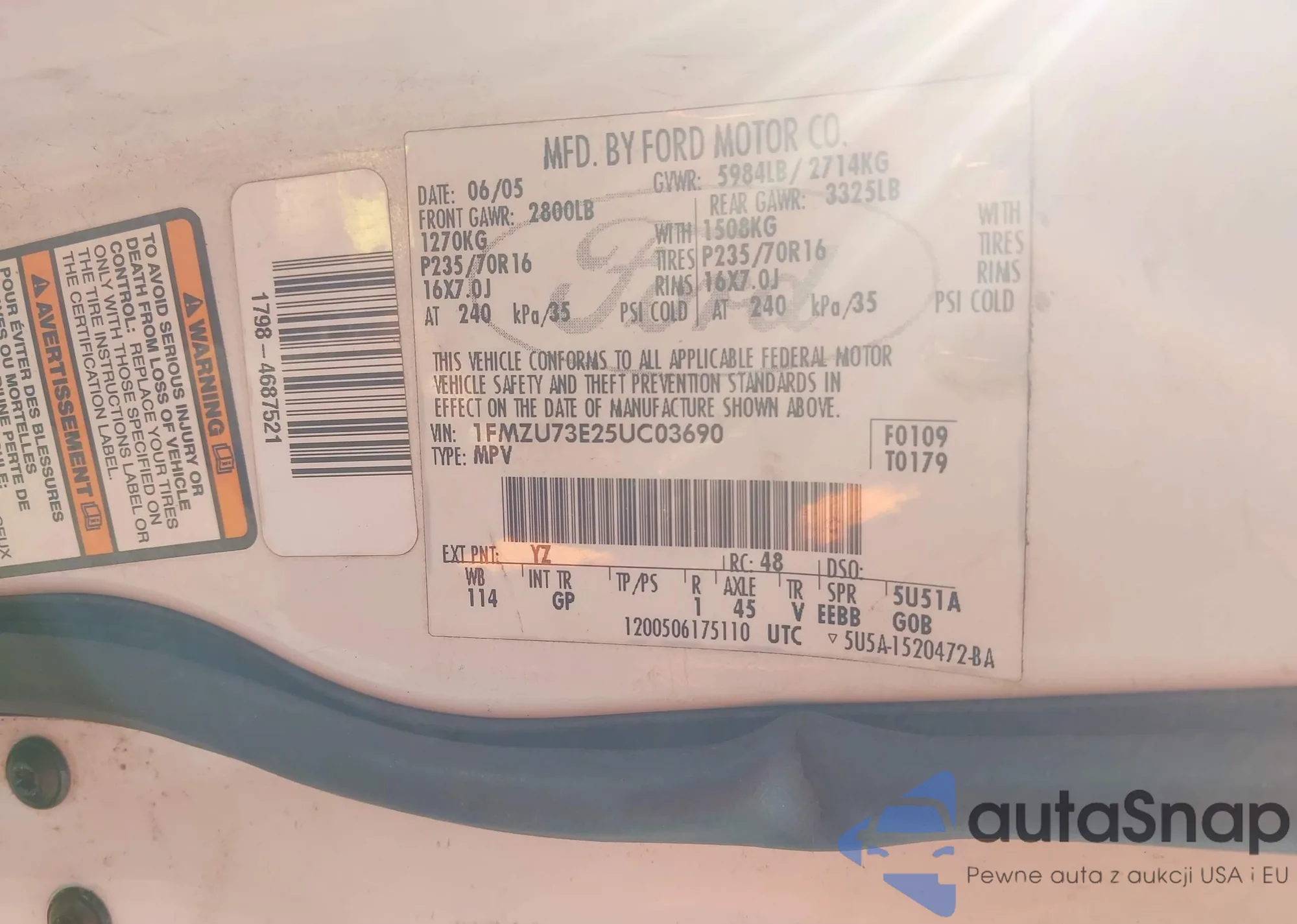 LOT: 43410747 VIN: 1FMZU73E25UC03690
