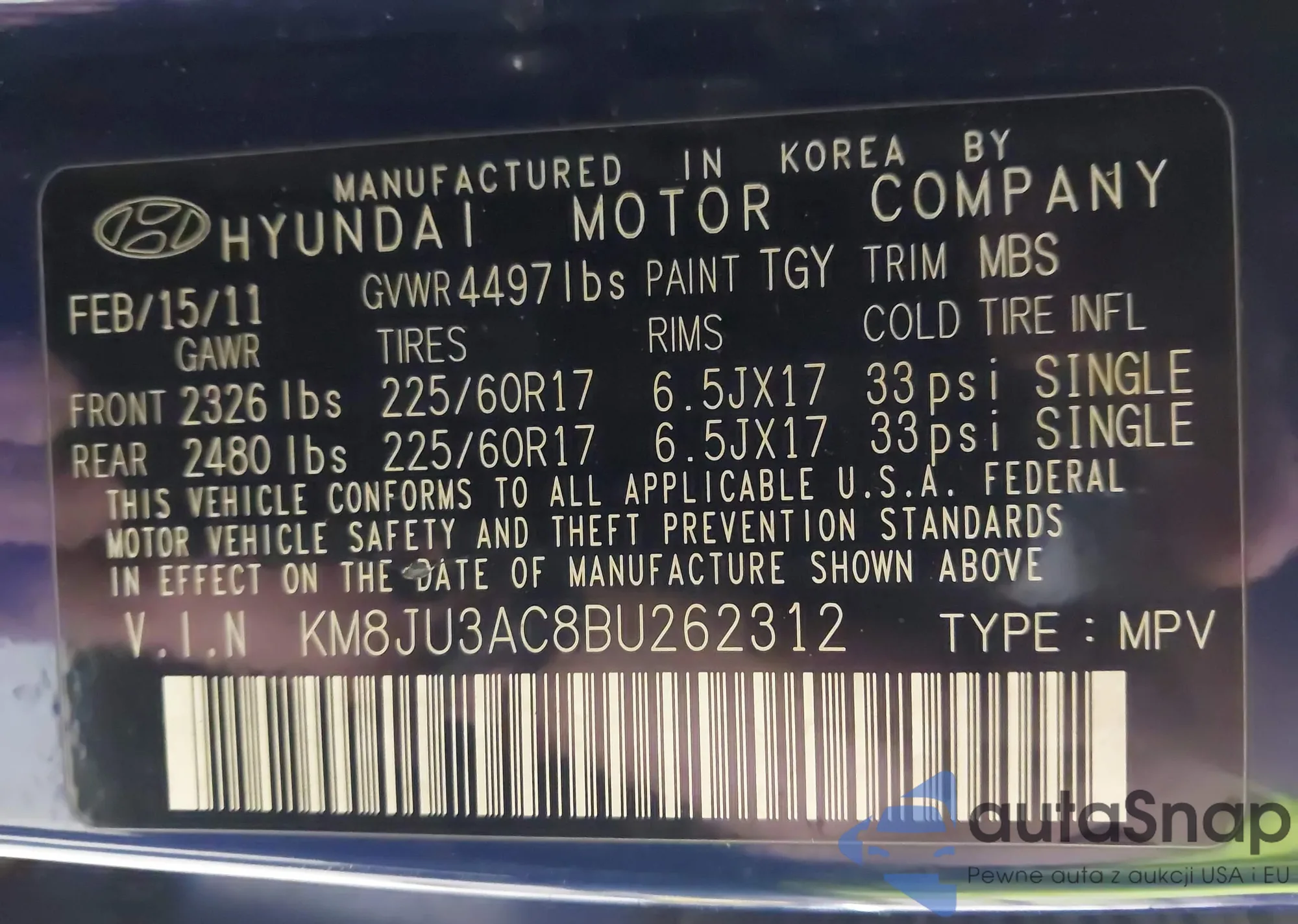 LOT: 43424291 VIN: KM8JU3AC8BU262312