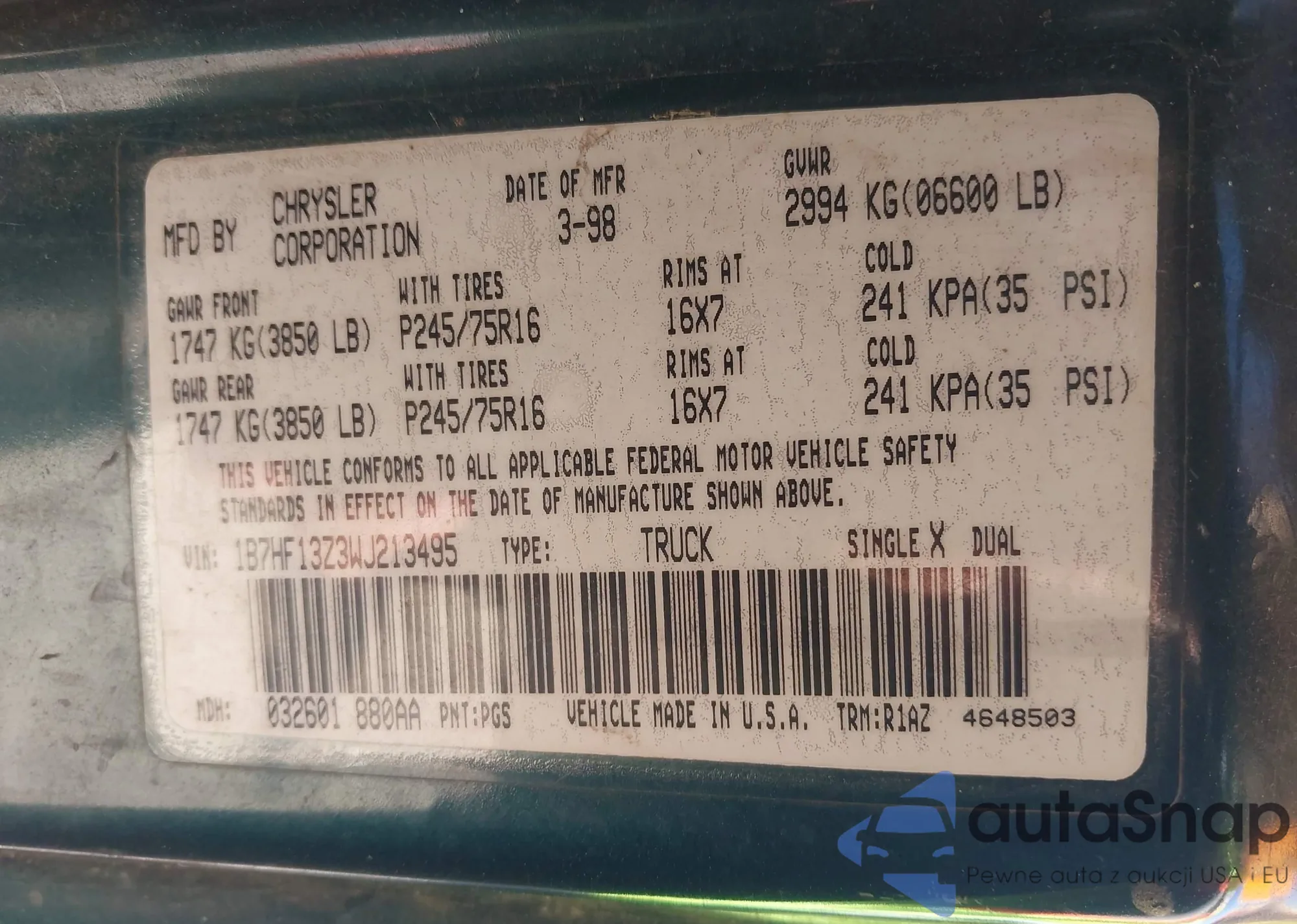 • VIN 1B7HF13Z3WJ213495