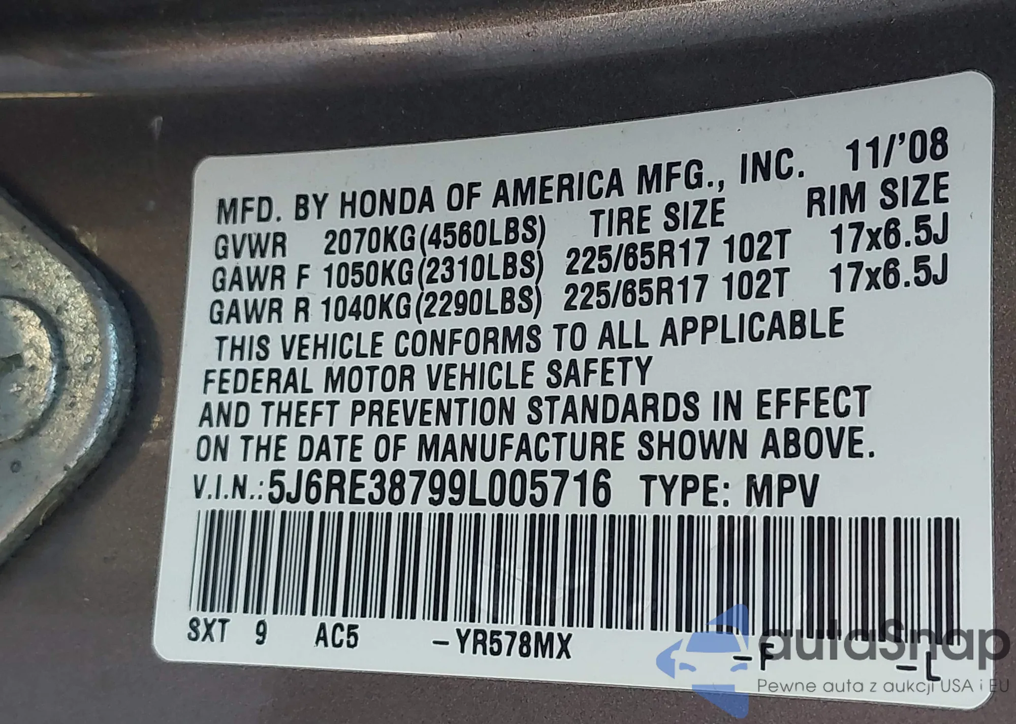 • VIN 5J6RE38799L005716