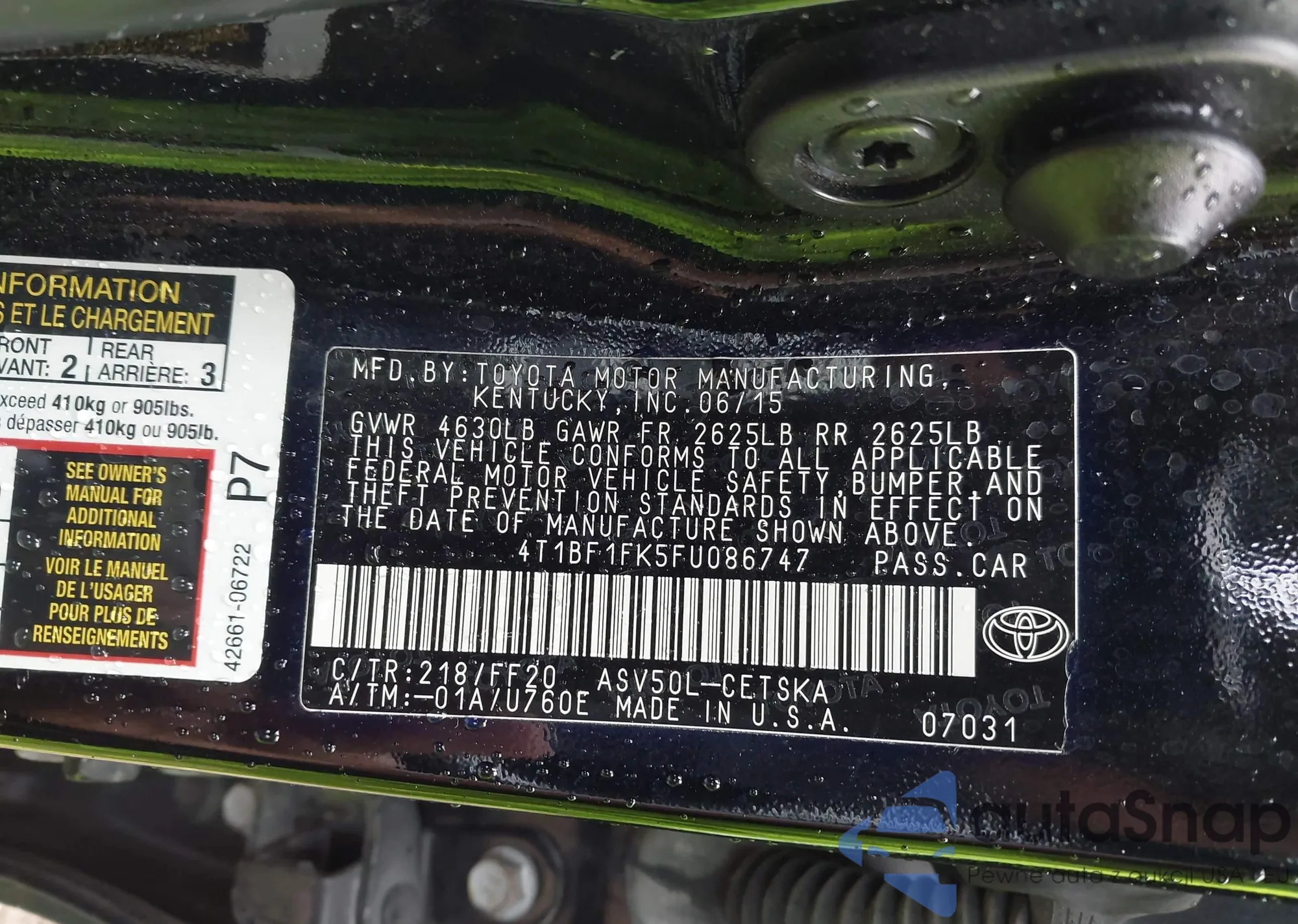 • VIN 4T1BF1FK5FU086747