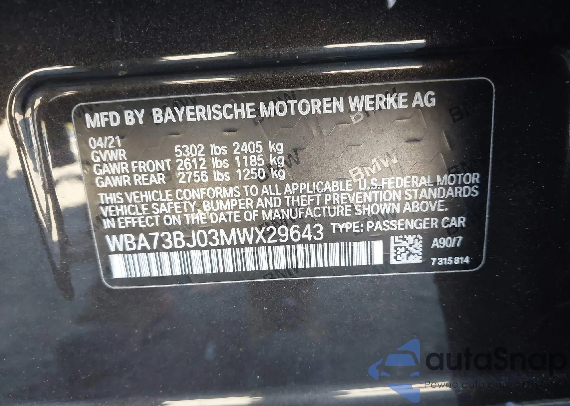 LOT: 43544865 VIN: WBA73BJ03MWX29643