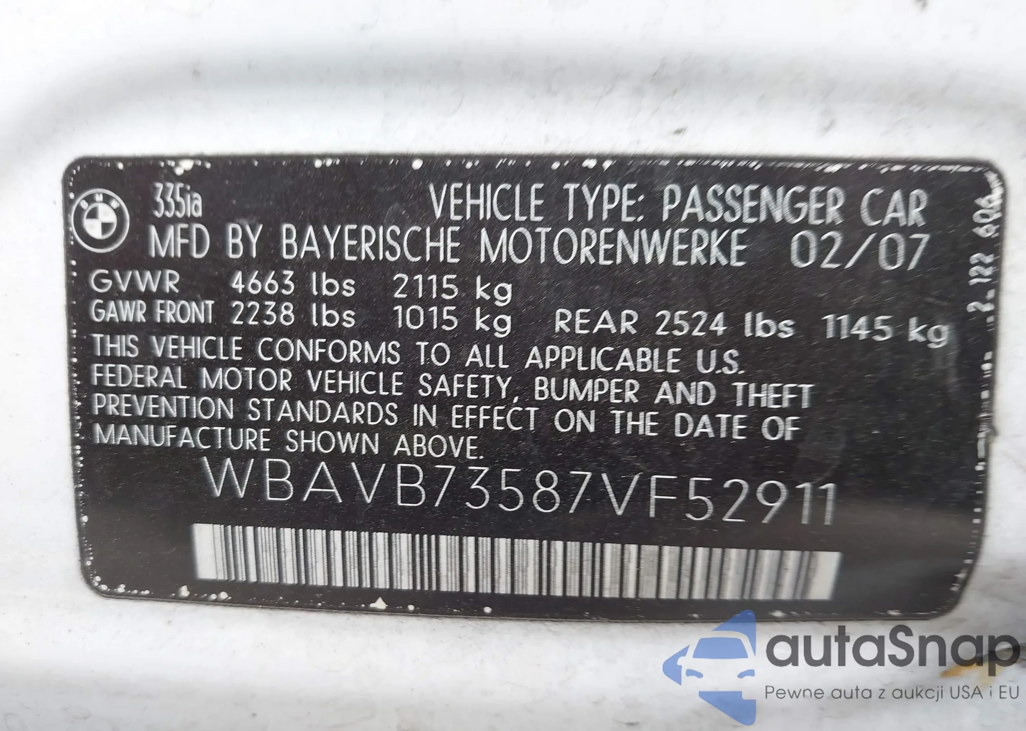 2007 BMW 335I z USA, uszkodzony, nr VIN WBAVB73587VF52911