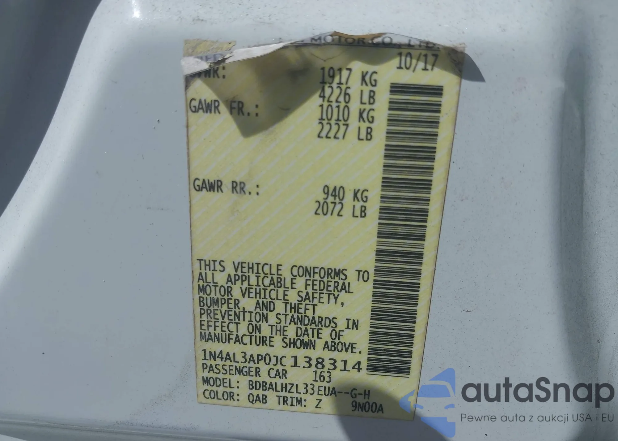 LOT: 43295931 VIN: JHLRE4H33AC003315