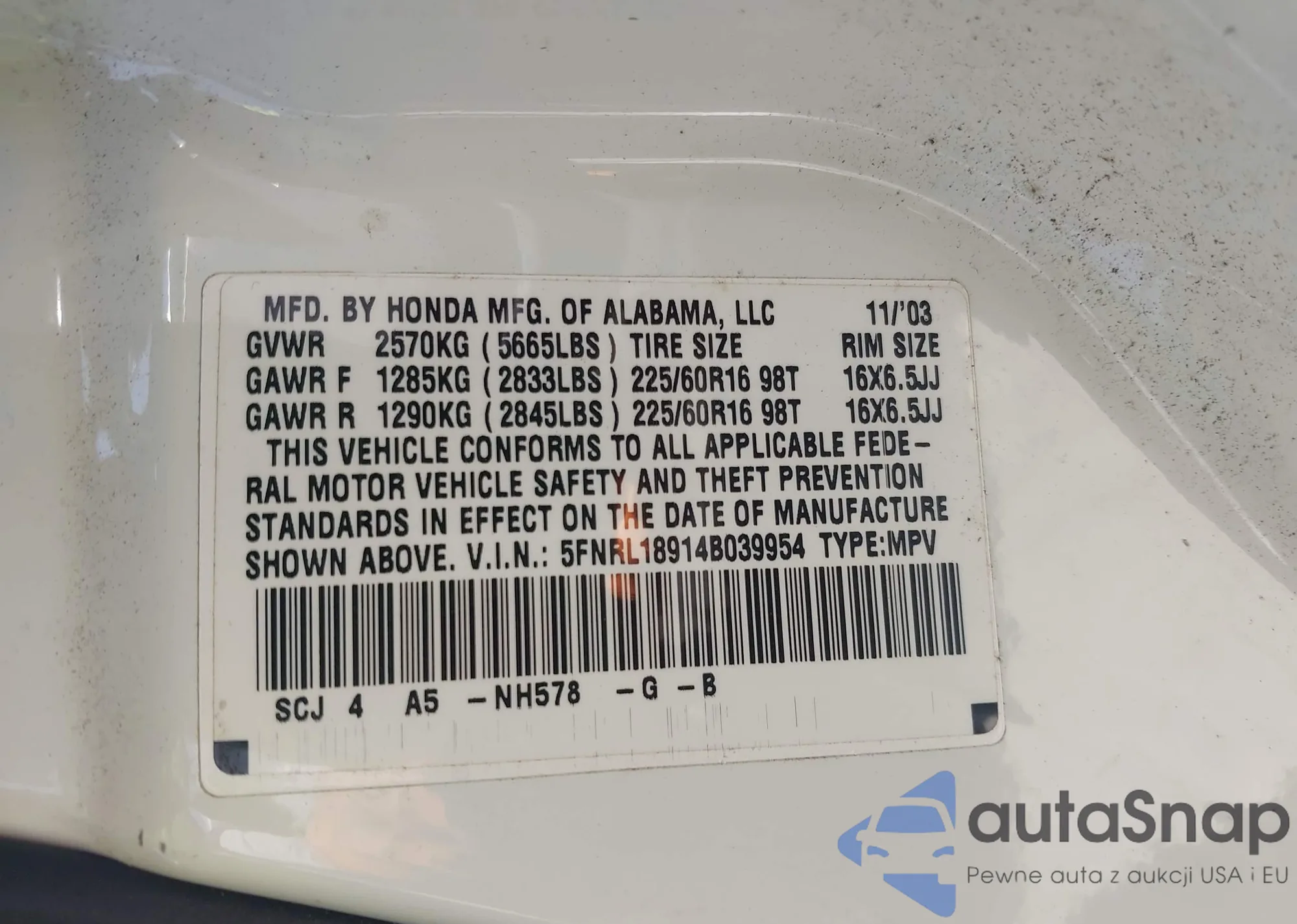 • VIN 5FNRL18914B039954
