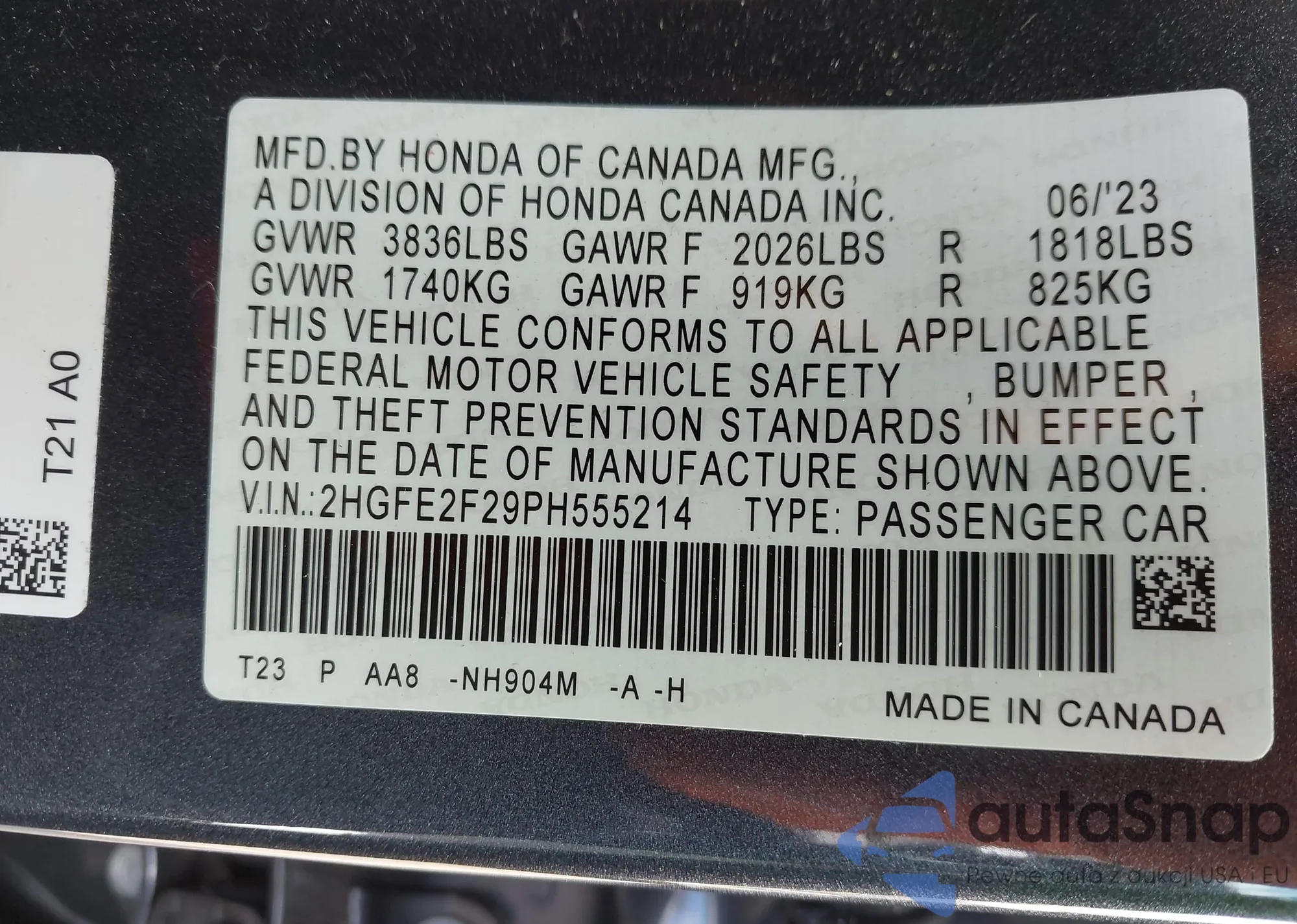 LOT: 43130875 VIN: 2HGFE2F29PH555214