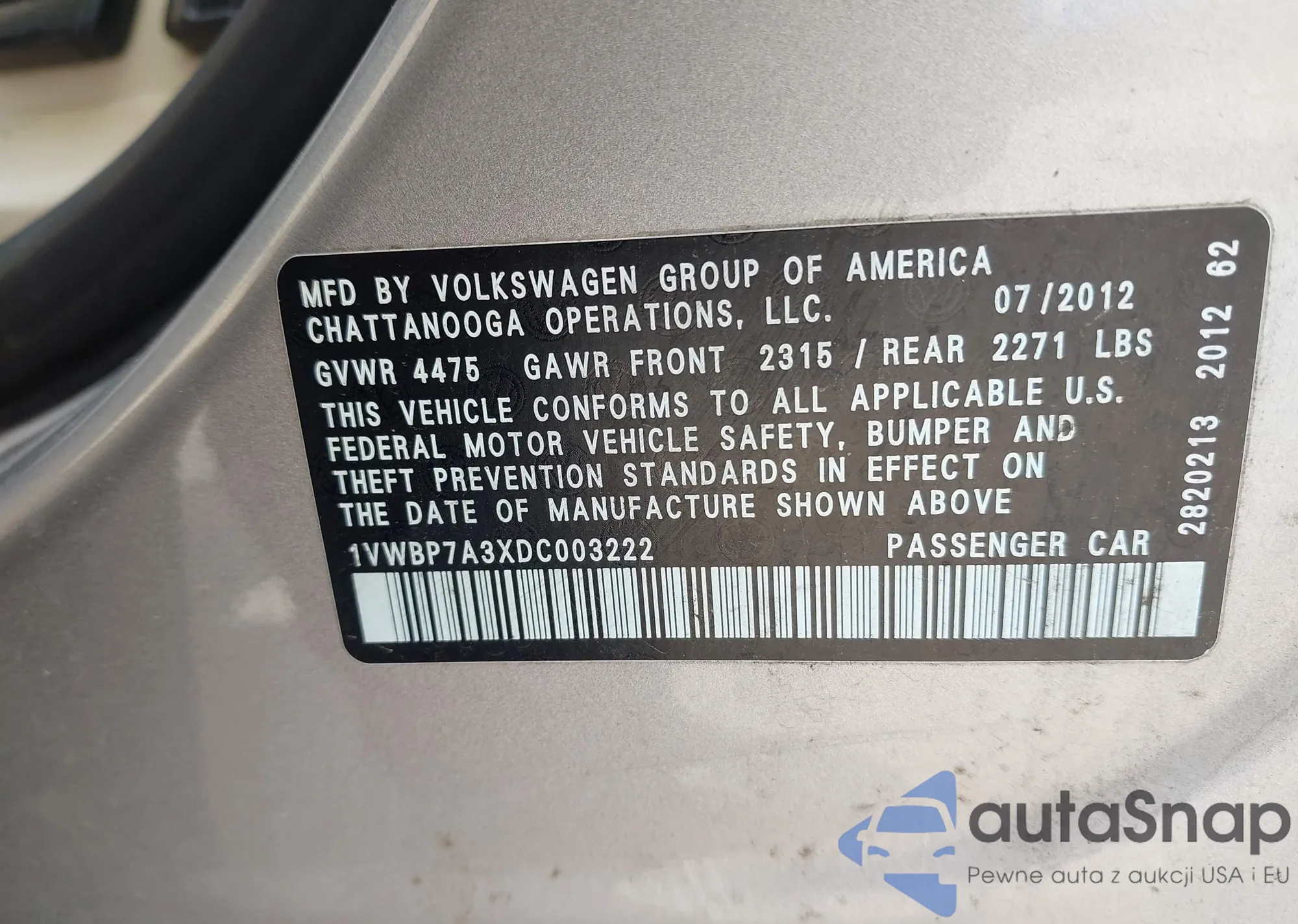 • VIN 1VWBP7A3XDC003222
