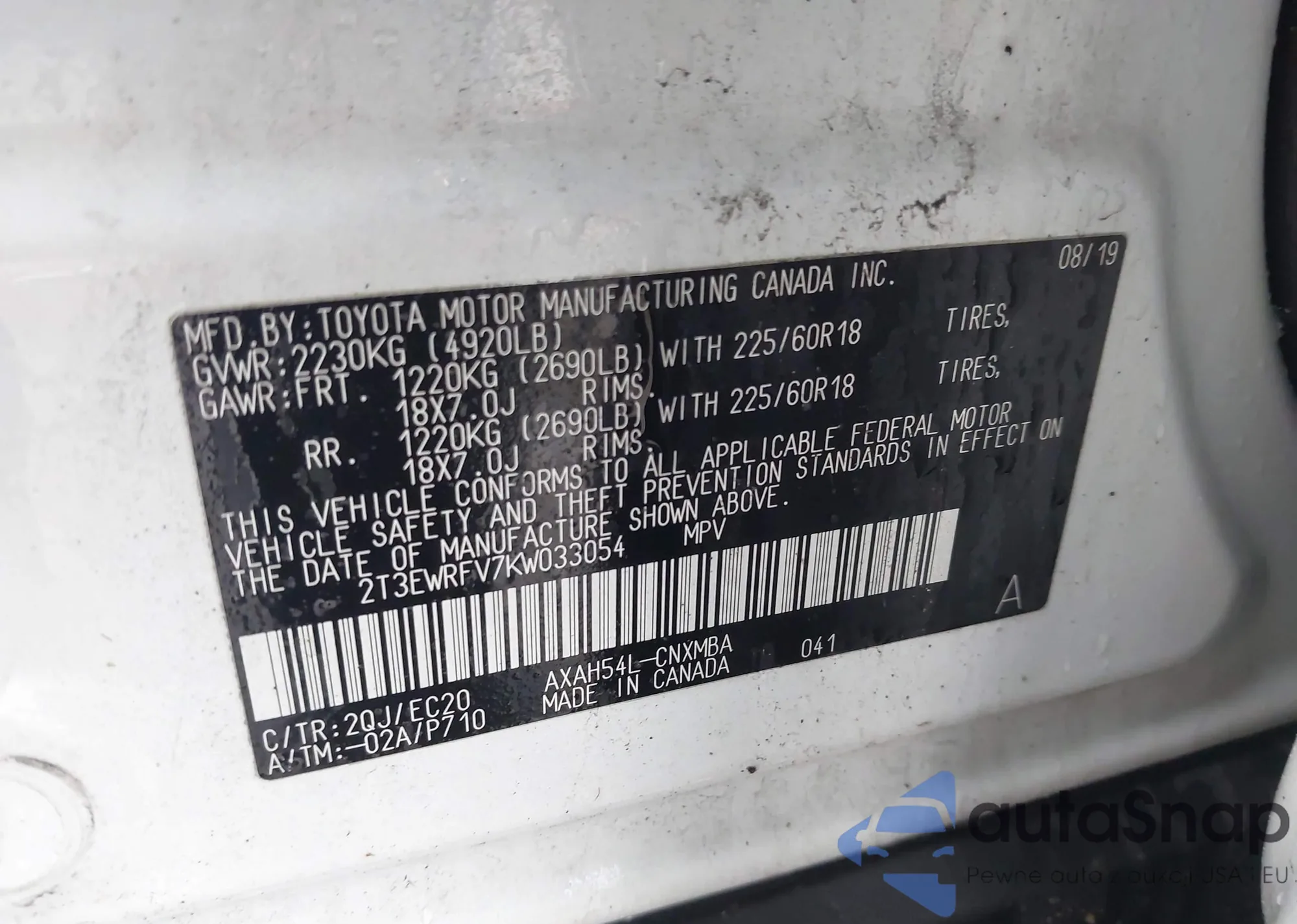 • VIN 2T3EWRFV7KW033054