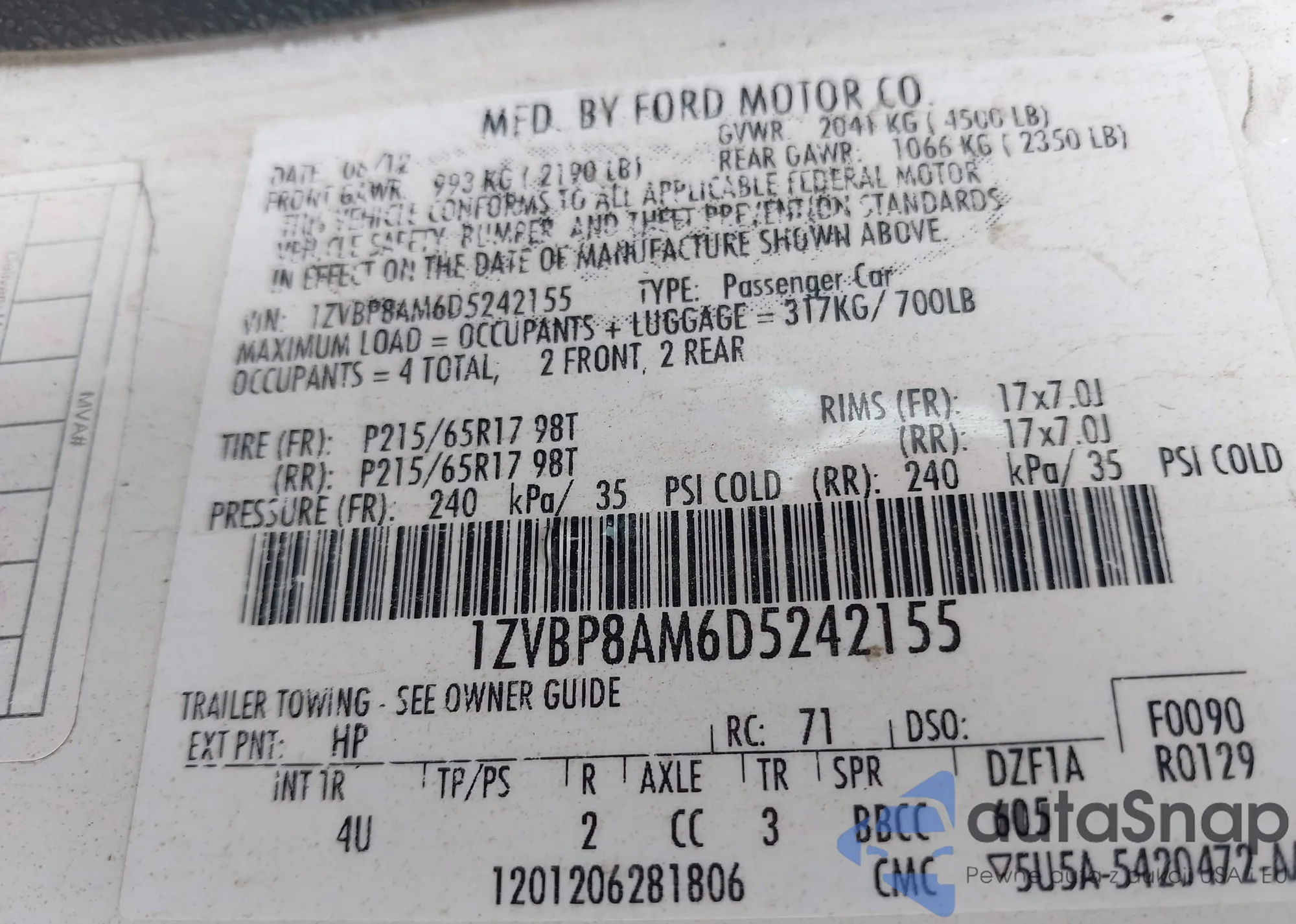 LOT: 43297385 VIN: 1ZVBP8AM6D5242155