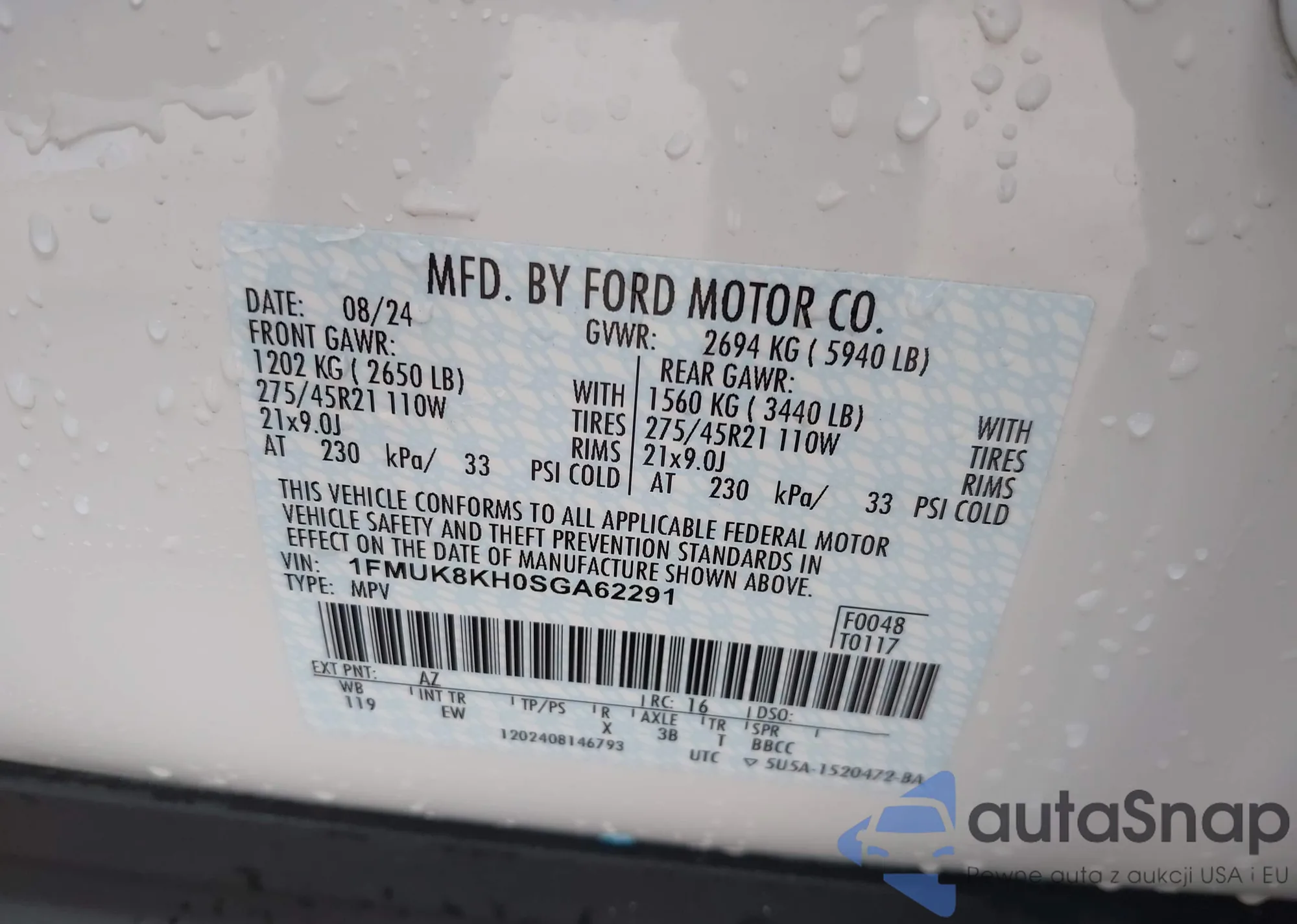 • VIN 1FMUK8KH0SGA62291