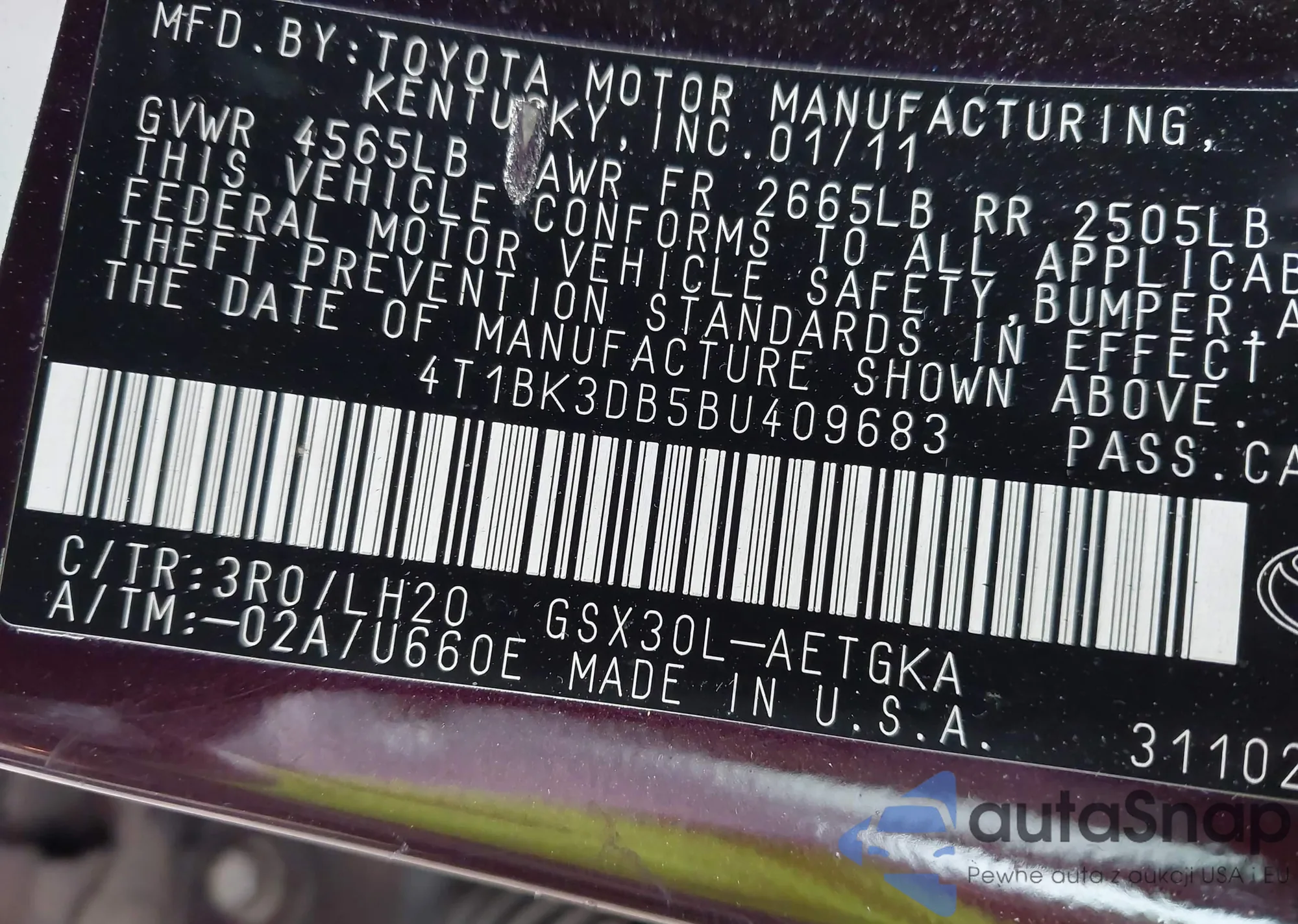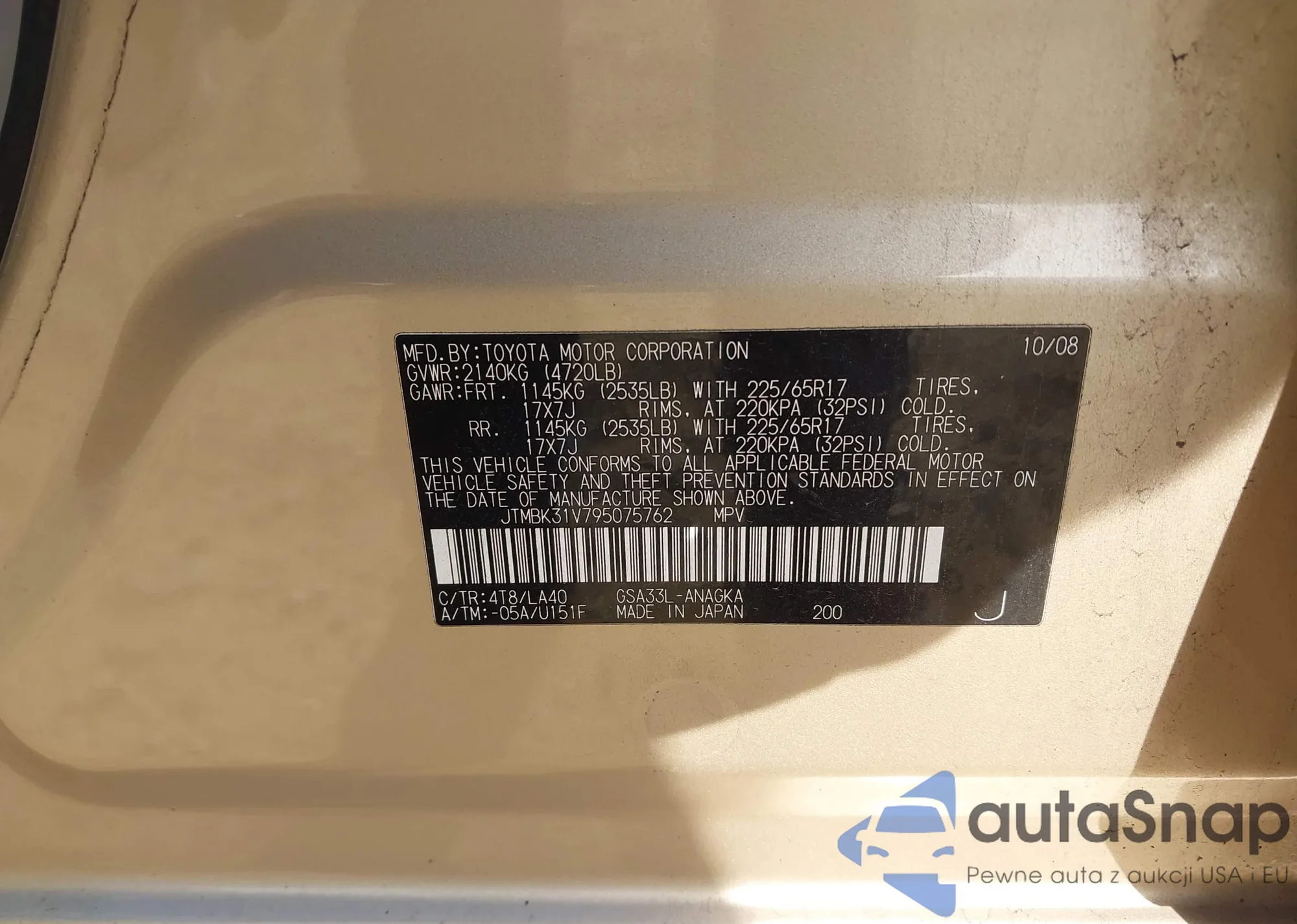 LOT: 43575591 VIN: JTMBK31V795075762
