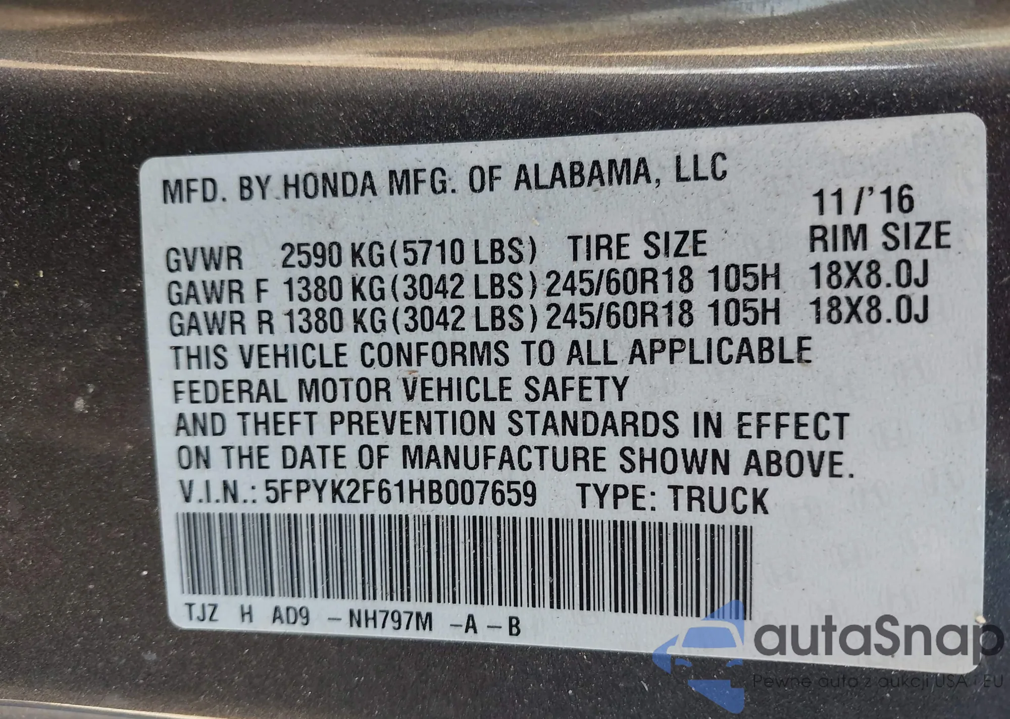 • VIN 5FPYK2F61HB007659