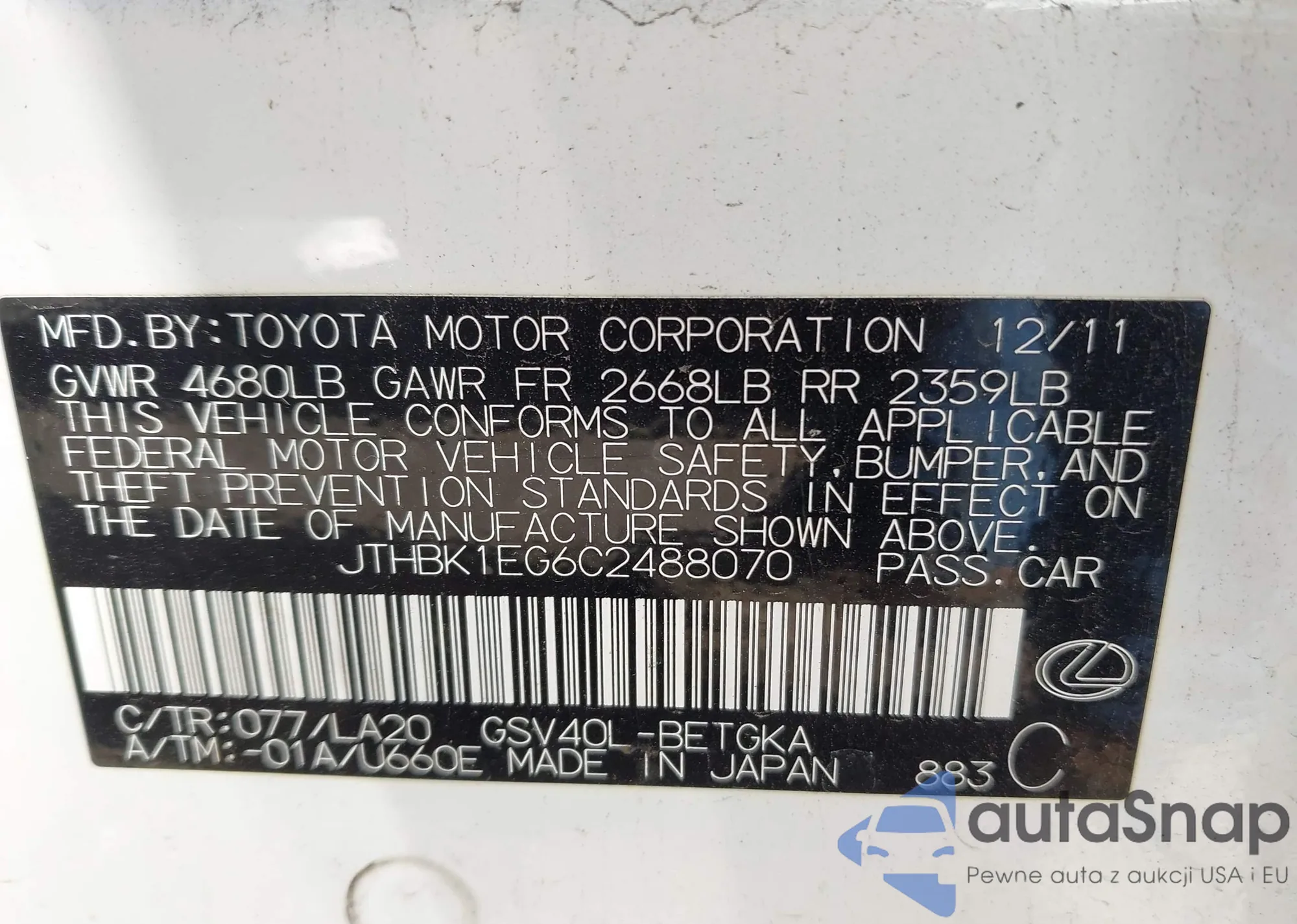 • VIN JTHBK1EG6C2488070