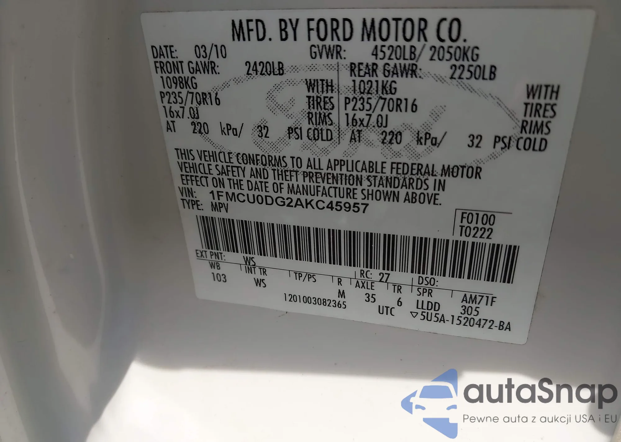 • VIN 1FMCU0DG2AKC45957