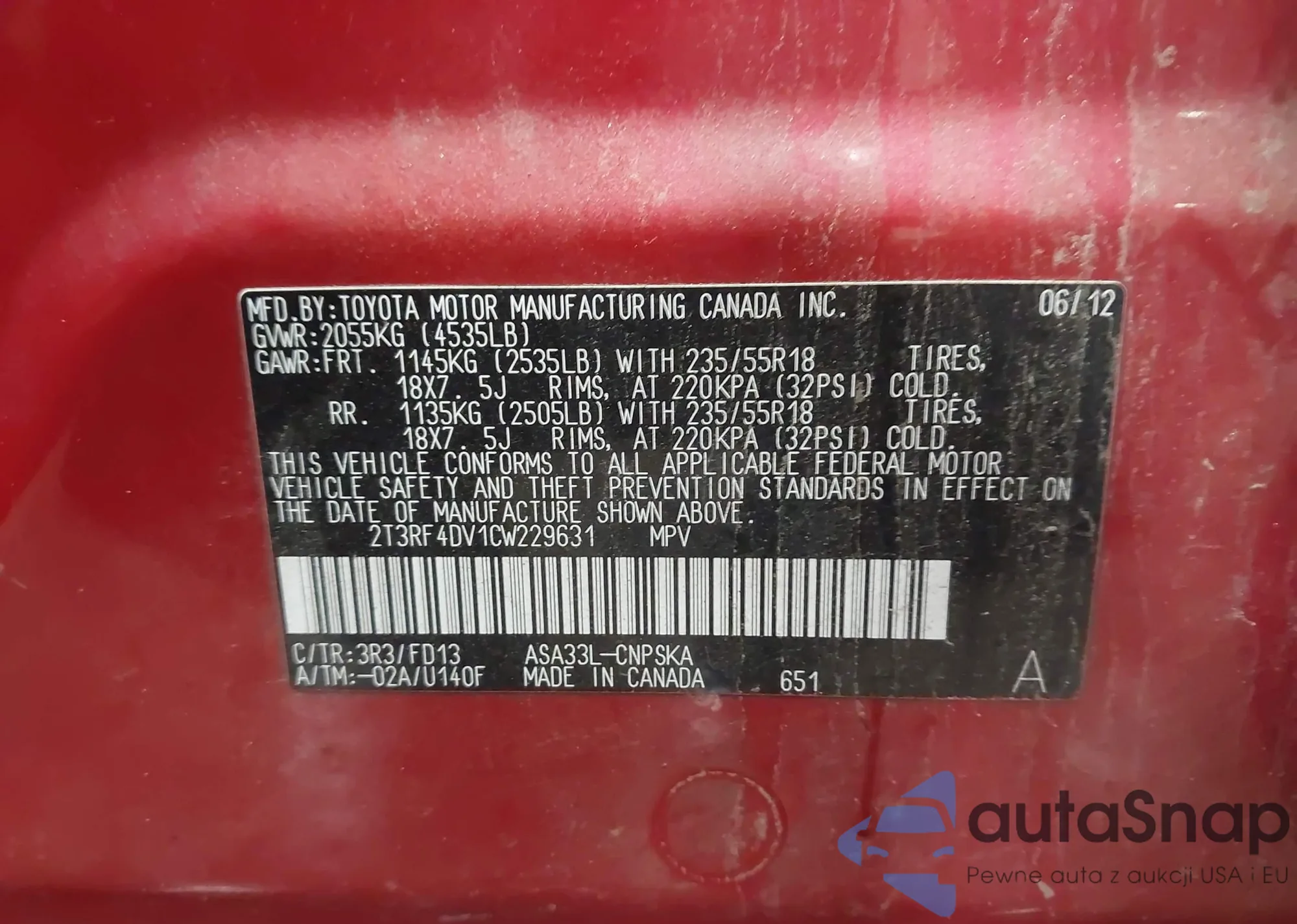 LOT: 43121221 VIN: 5YFBU4EE7CP007241