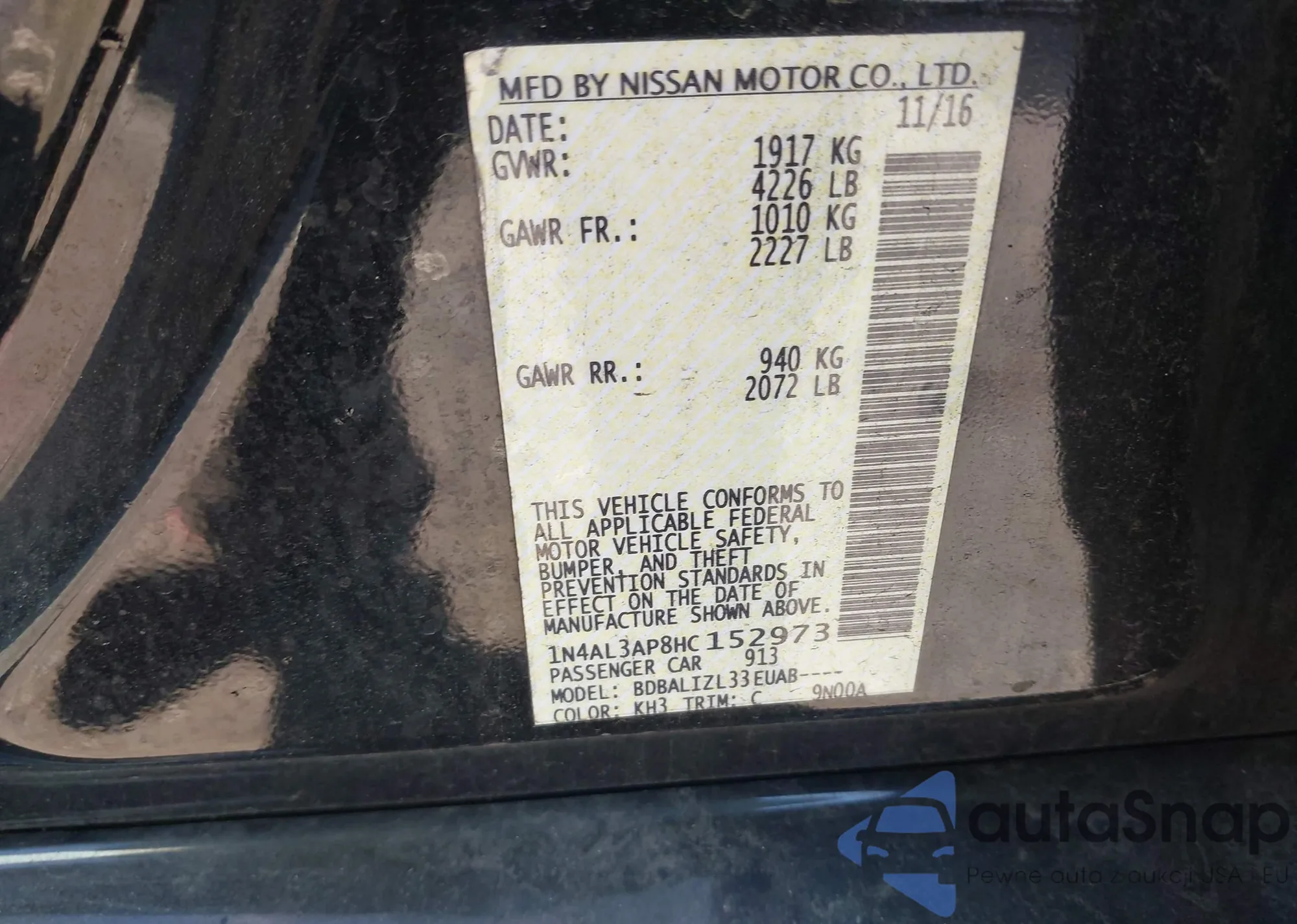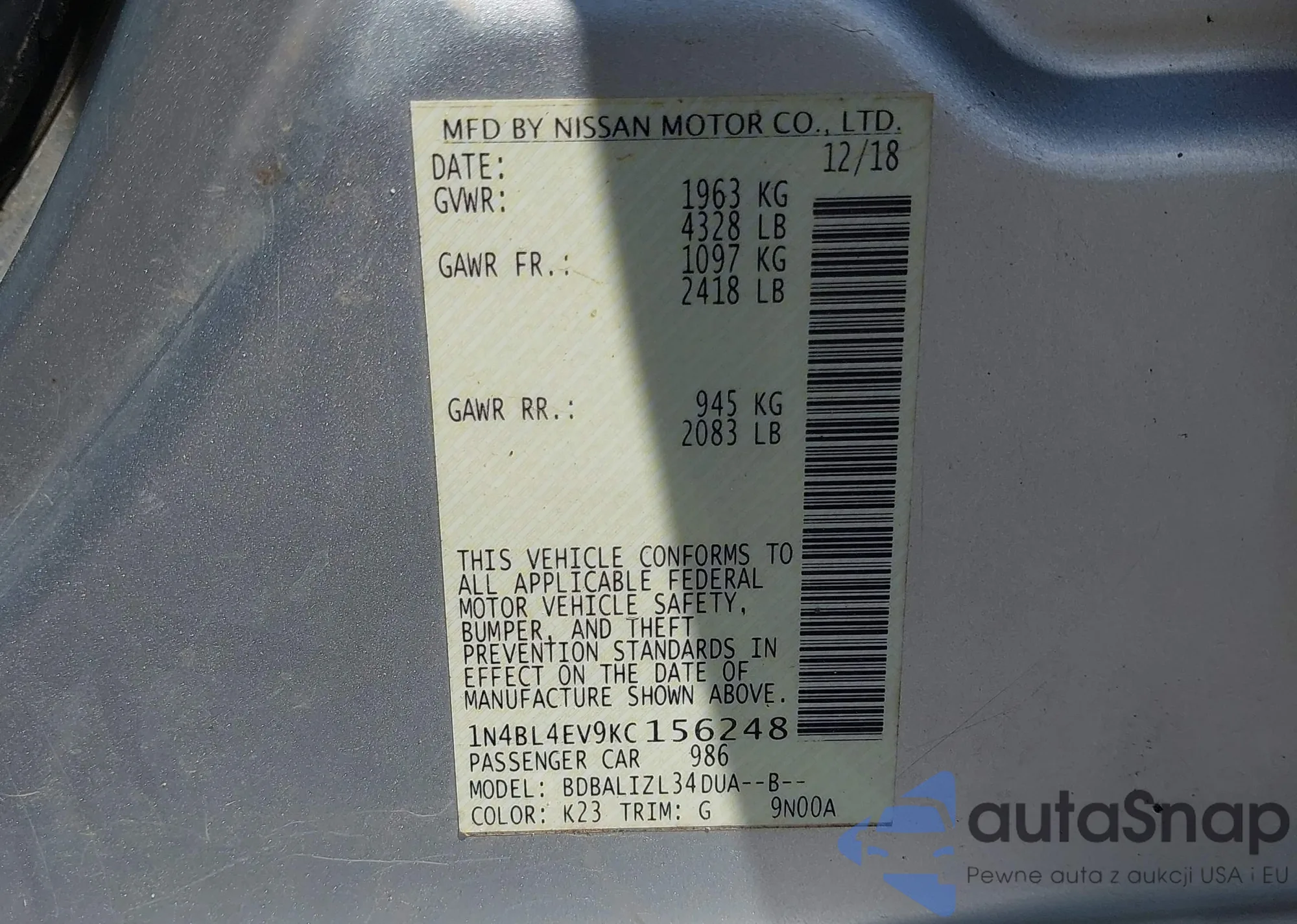 • VIN 1N4BL4EV9KC156248