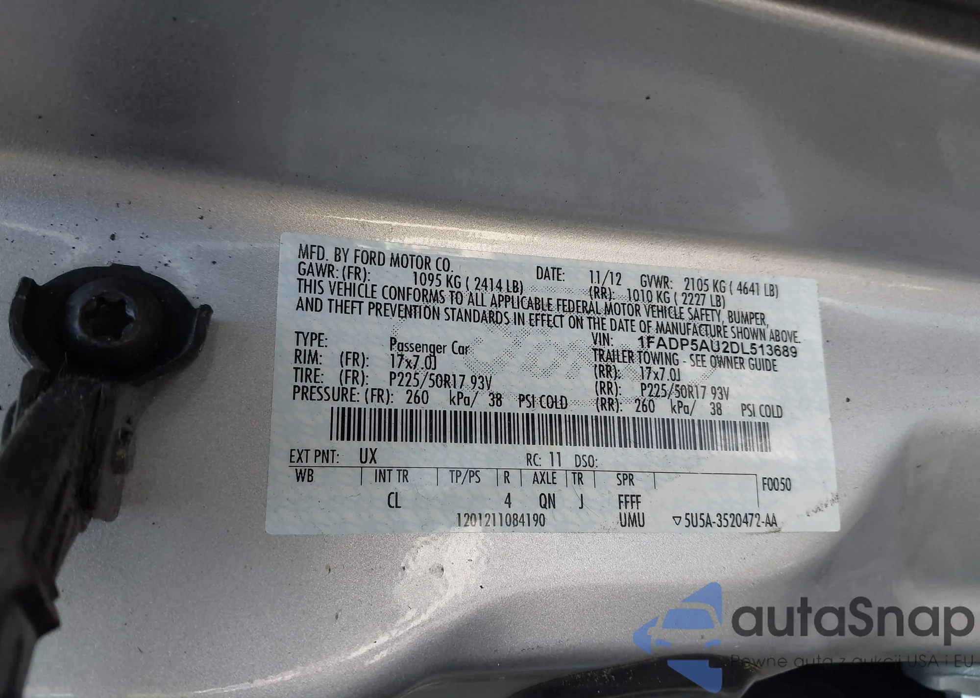 LOT: 43007476 VIN: 1FADP5AU2DL513689
