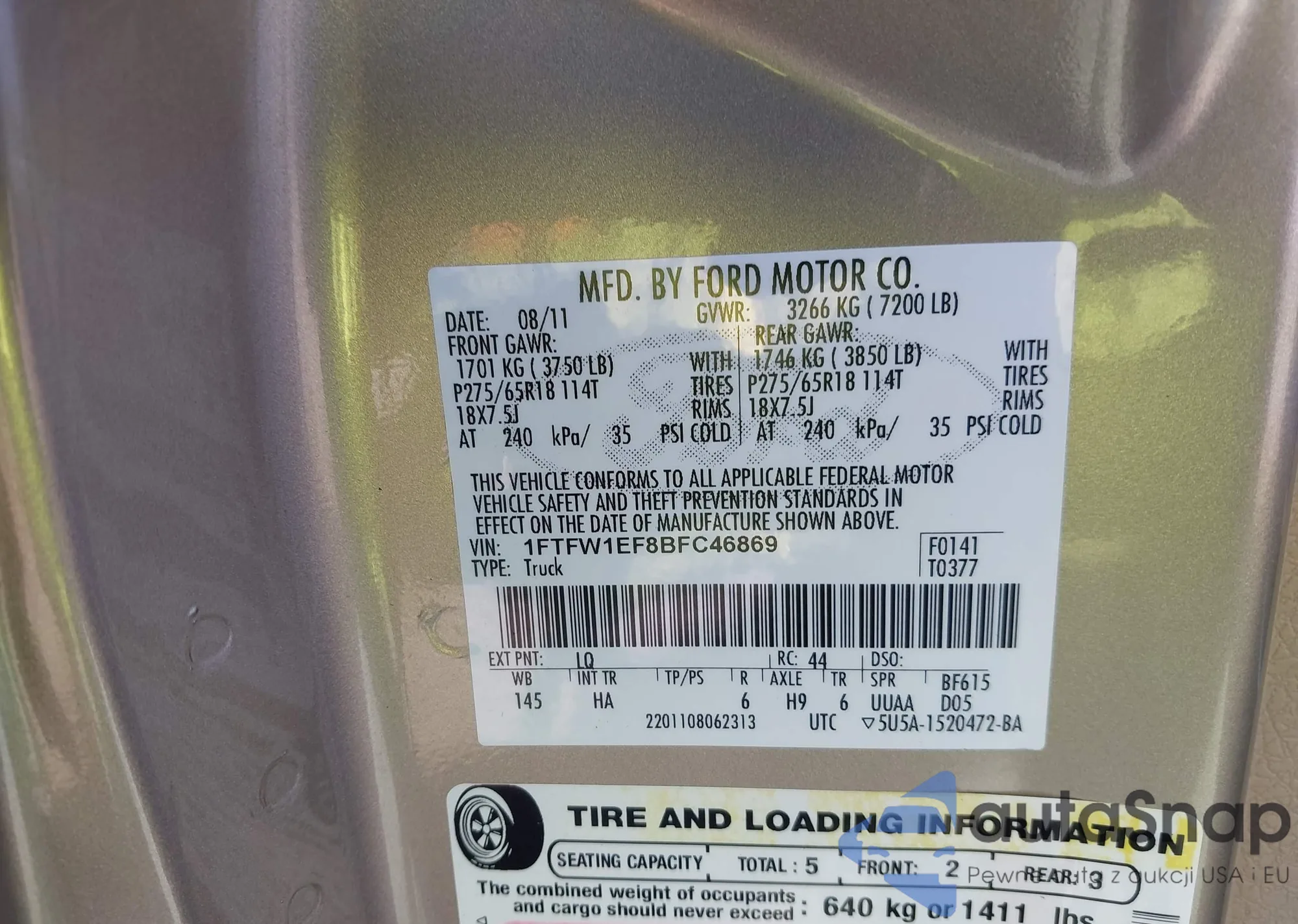 LOT: 43168252 VIN: 1FTFW1EF8BFC46869