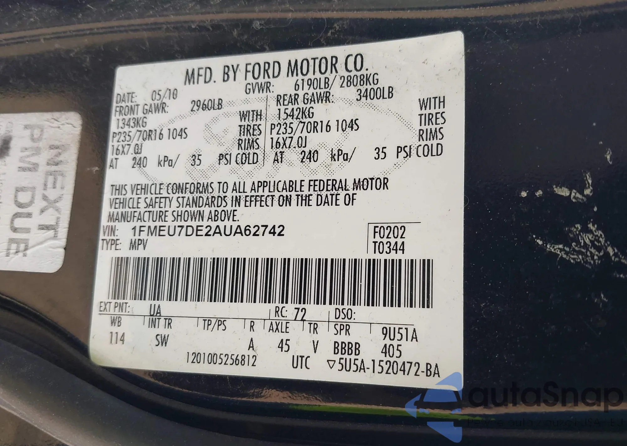 • VIN 1FMEU7DE2AUA62742