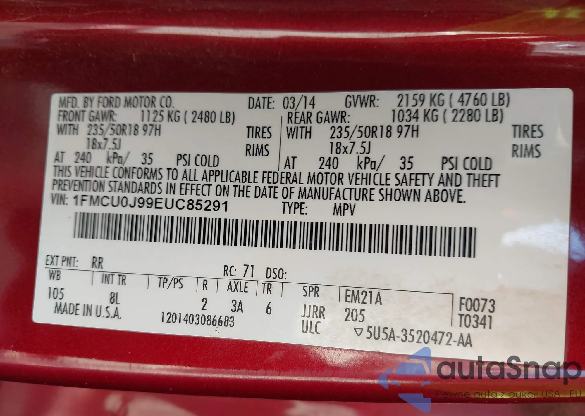 LOT: 43306333 VIN: 1FMCU0J99EUC85291