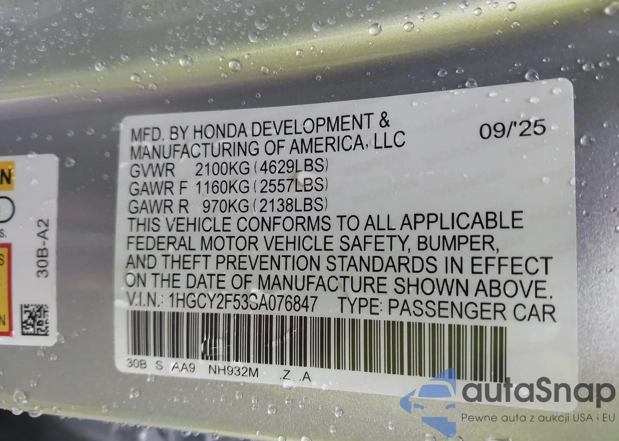 • VIN 1HGCY2F53SA076847