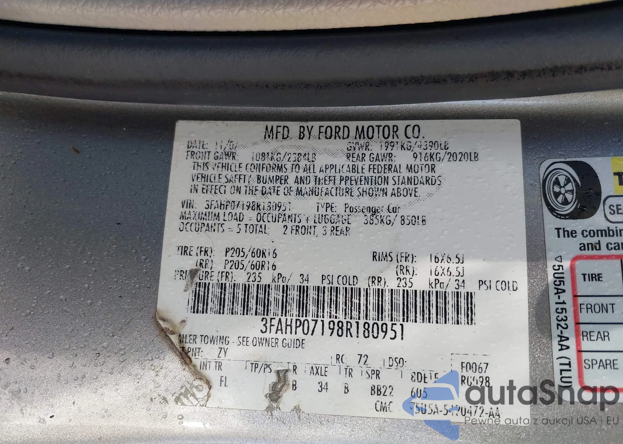 LOT: 43579391 VIN: 3FAHP07198R180951